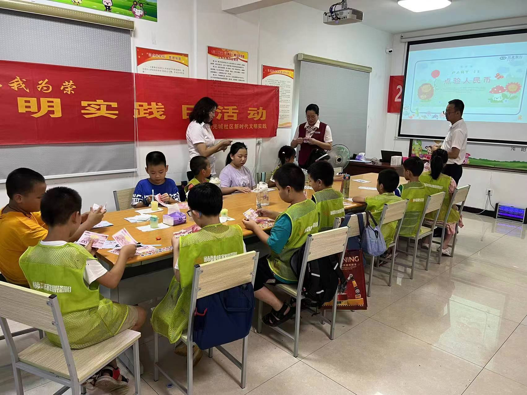 作为暑期托管服务的第二个年头,阳光城社区还致力于整合社区慈善资源,引导周边专业力量进托管课堂,链接高校老师、社区能人开展了心理健康、手工制作、机器人编程、亲子音乐会等课程,更积极会同共青团、妇联、工会等组织,通过多种途径进行理财、急救、交通、消防等教育活动。8月8日,社区邀请兴业银行在四期青少年空间开展了“小小银行家”少儿理财教育实践活动,通过互动游戏、情景模拟、故事演绎等方式,让孩子们体验了一次富有意义的财商之旅,了解到关于货币和金钱的小知识,帮助儿童建立良好的理财意识和储蓄观念。