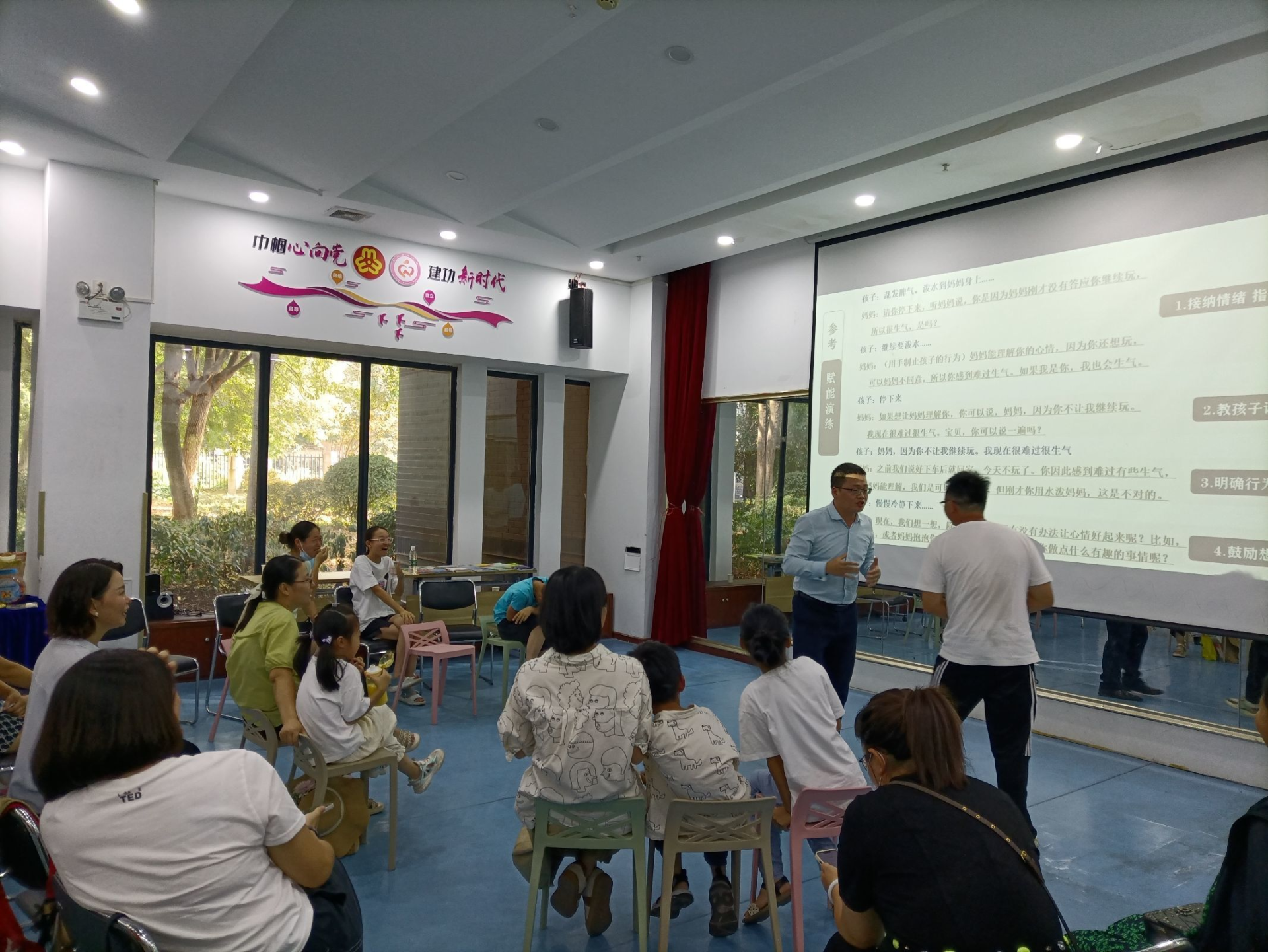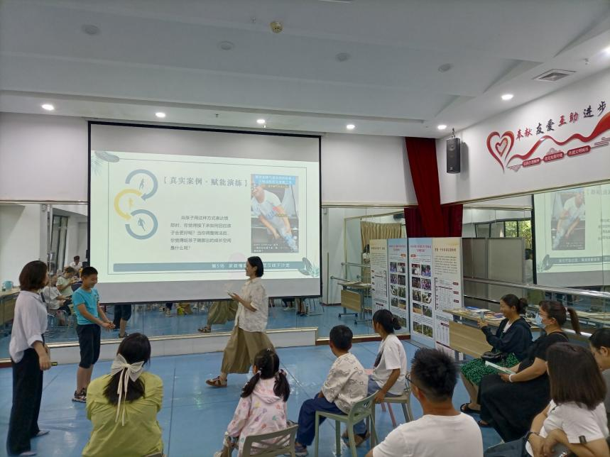 在主持人的引导下,趣味破冰从自我介绍开始。大家彼此交流,诉说着自己在情绪管理上遇到的困惑和堵点。随后,刘老师通过“如何培养孩子的情绪管理能力”主题课堂,分析孩子内心的真实语言,借用真实案例,引导家长识别愤怒、理清边界、回应愤怒,保护孩子健康成长,也让自己成为更好的家长。赋能演练环节,志愿者们走上台,扮演儿童和家长,将知识迁移真实情境,帮助大家体会情绪管理的重要性。