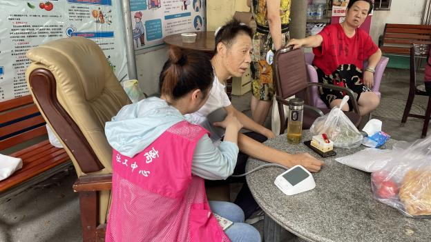 走访完独居老人后,社工站社工还为小区公共空间休息的老人们测量血压。在一片欢声笑语中结束了本次走访。