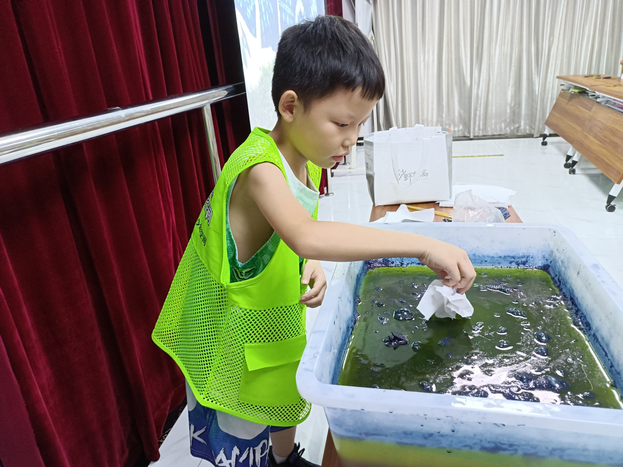 “老师我要染布,我要染一个有花朵的布。”“我要染一个有蝴蝶的布。”小朋友们被扎染的独特之美所吸引,迫不及待地想要开始自己的扎染之旅。老师将扎染所需工具依次分发,小朋友们拿着弹珠和橡皮筋,通过图案设计定位折叠、捆扎、点缀、夹等多种形式组合,最后把弹珠捆在布料上放进五颜六色的颜料中。