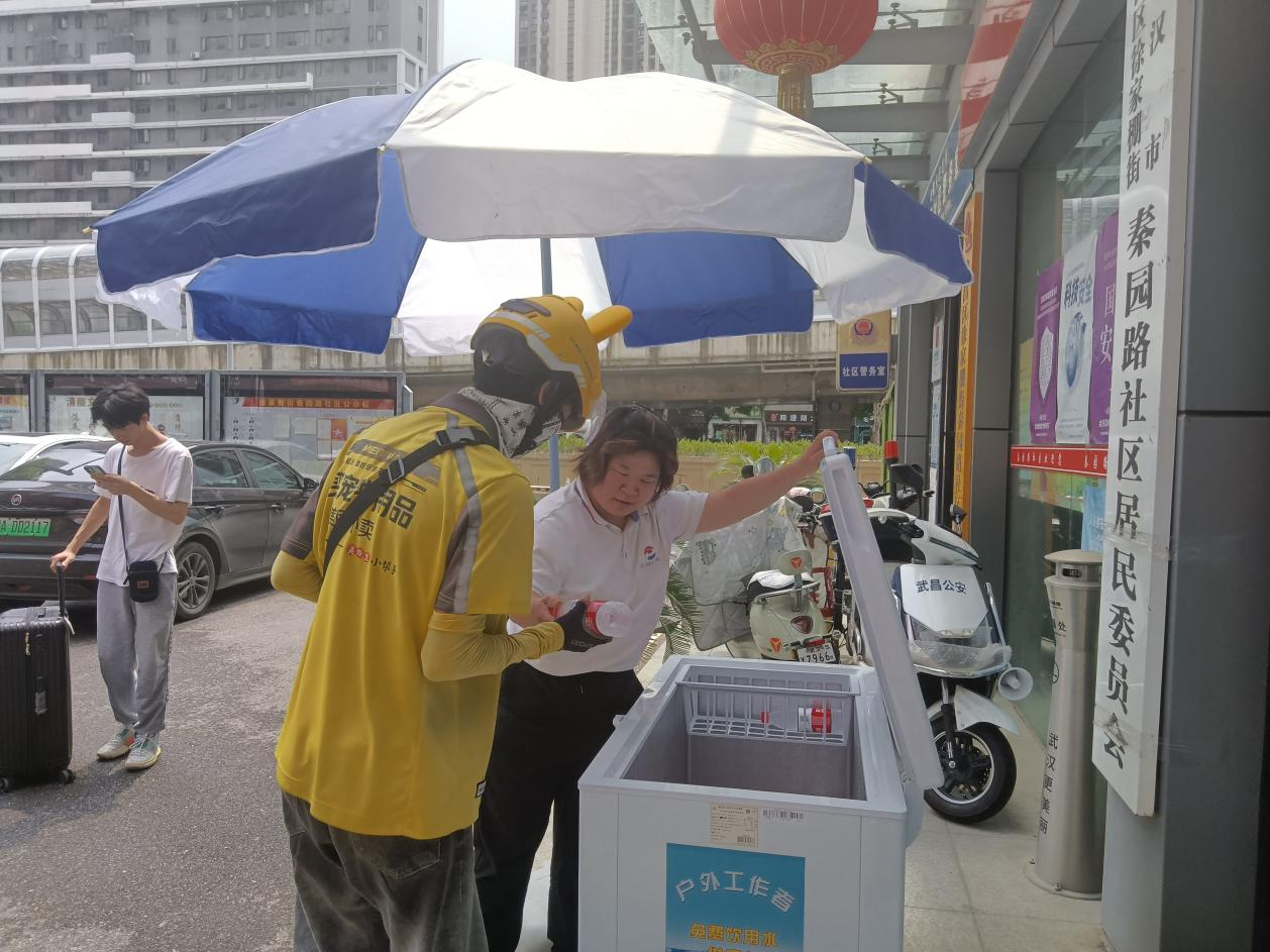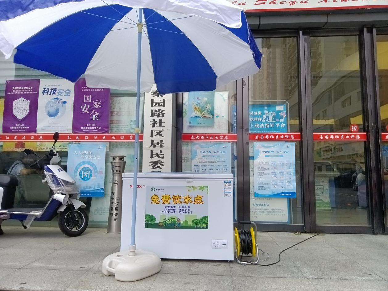 时值盛夏,酷暑难耐,但有这样一群人,头顶烈日,挥汗如雨,不辞辛劳地坚守在工作岗位上,为这座城市的正常运行默默奉献,他们就是环卫工人、快递小哥和外卖骑手等户外工作者。为了让户外高温工作者们在炎热的工作环境里获得清凉,让他们切实感受到社会的关怀,武汉市武昌区徐家棚街道秦园路社区特地设立了“爱心饮水点”。