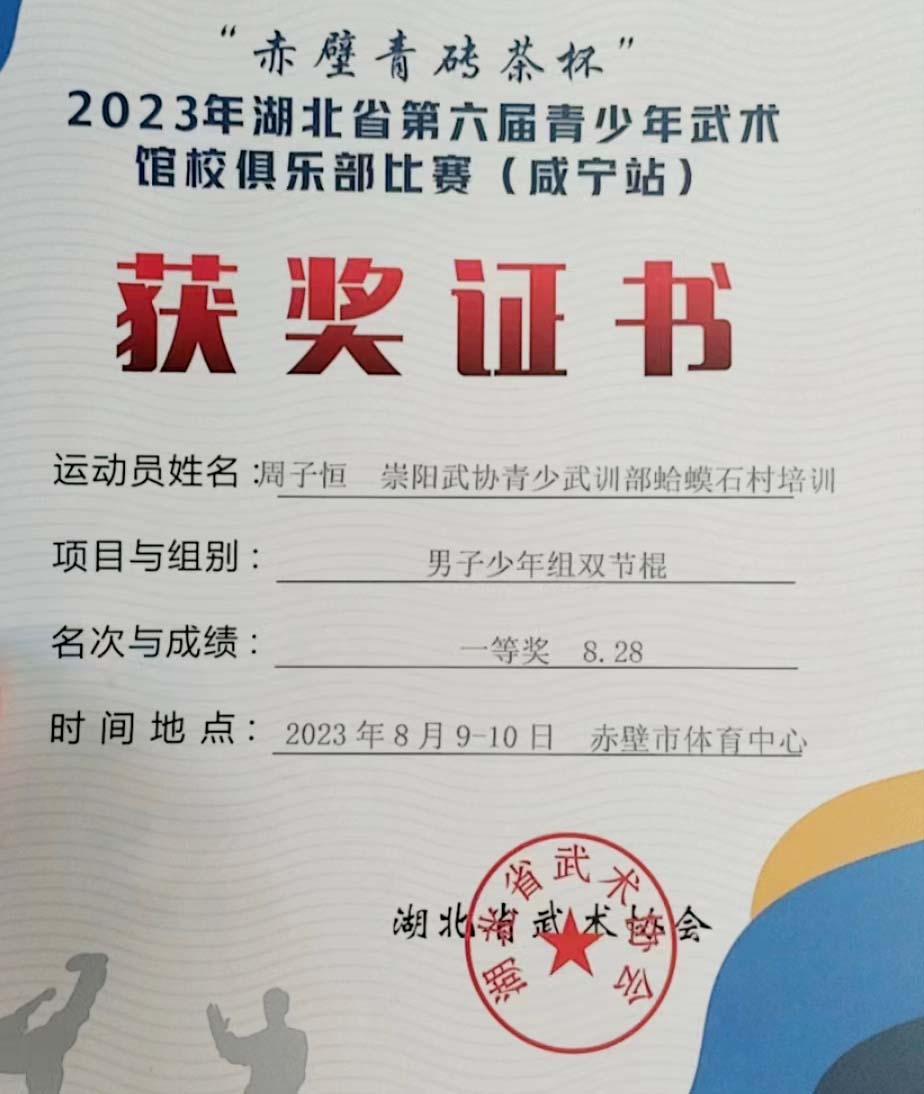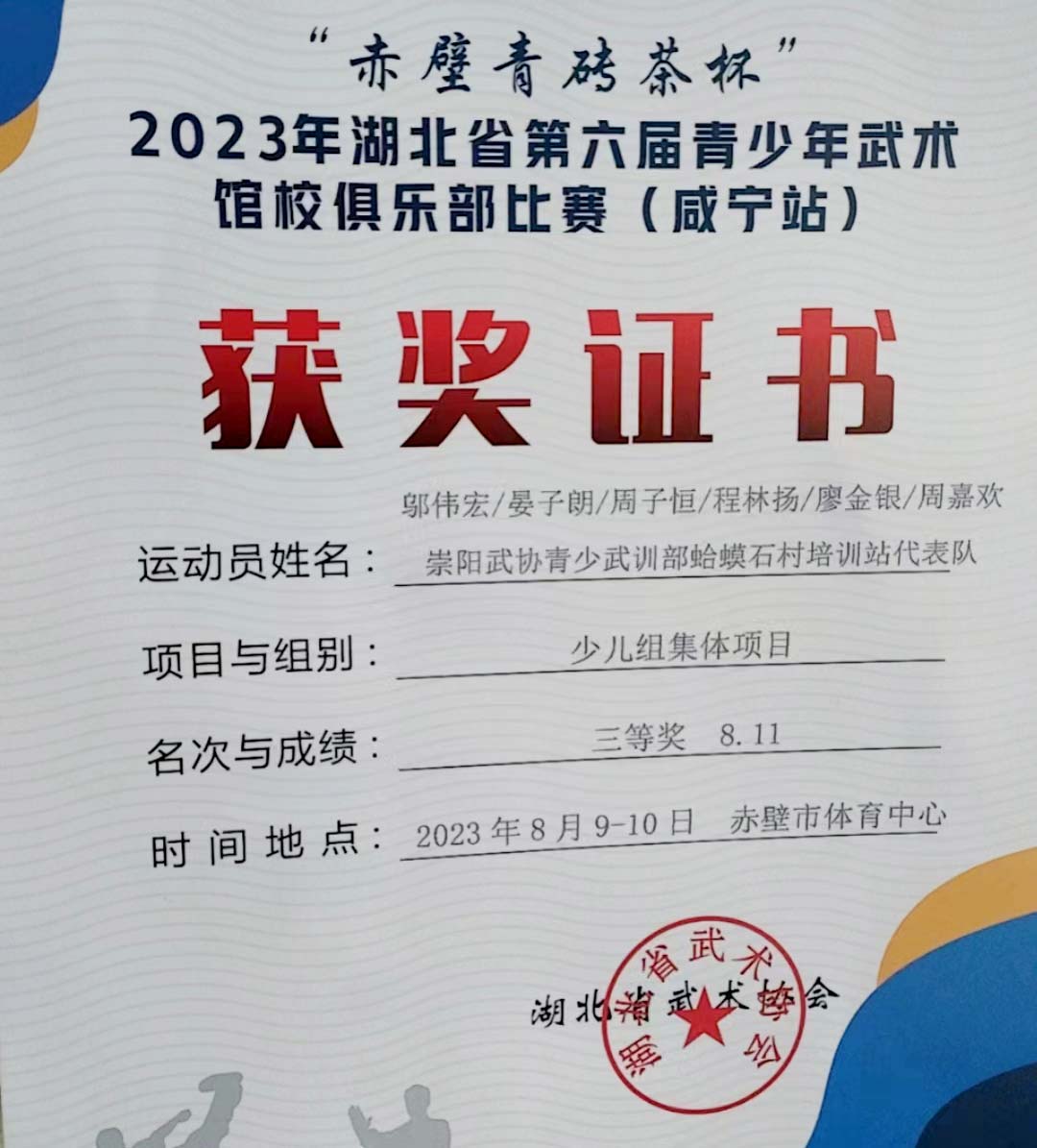 一份耕耘,一份收获。今年8月9日,邬师父带着武术队去赤壁参加了2023年湖北省第六届青少年武术馆校俱乐部(咸宁站)比赛,孩子们勇敢地站到台上,展示了平日所学,在40支代表队的激烈角逐中,斩获了咸宁站男子少年组双节棍一等奖和其它四项个人、团体奖项。