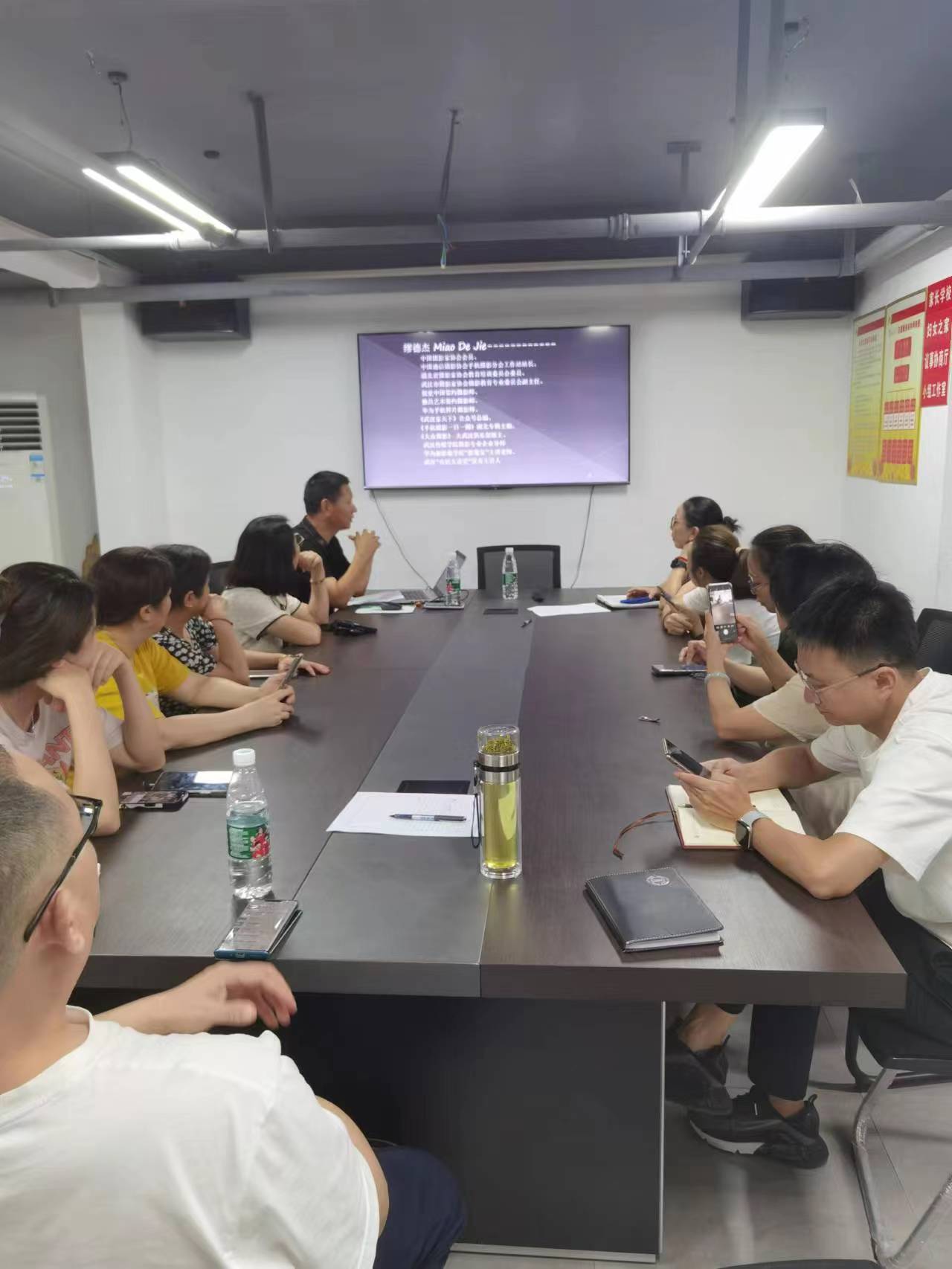 还特别强调了“拍照的用镜分为远、全、中、近、特,不同的镜头用于不同的目的,拍远山、大海用远镜头,拍人物腰部以上用中镜头,拍人物肩部以上或者脸部就用特写镜头。“常见使用的三分法构图、对称构图、框架构图、对角线构图、三角形构图、其他构图等方法”,并通过其拍摄的照片进行仔细讲解,社区工作人员们边学边看,不懂就问。有人问如何拍会议照片时,魏主任详细讲解不同场合如何用镜头、构图、光线等的综合运用。“如果是大会场,就要用全镜头,从下往上拍,或者从左往右拍。”他带着大家在会议现场拍照片,大家惊叹:“这通过讲解了之后拍出了人民大会堂的感觉啊!”