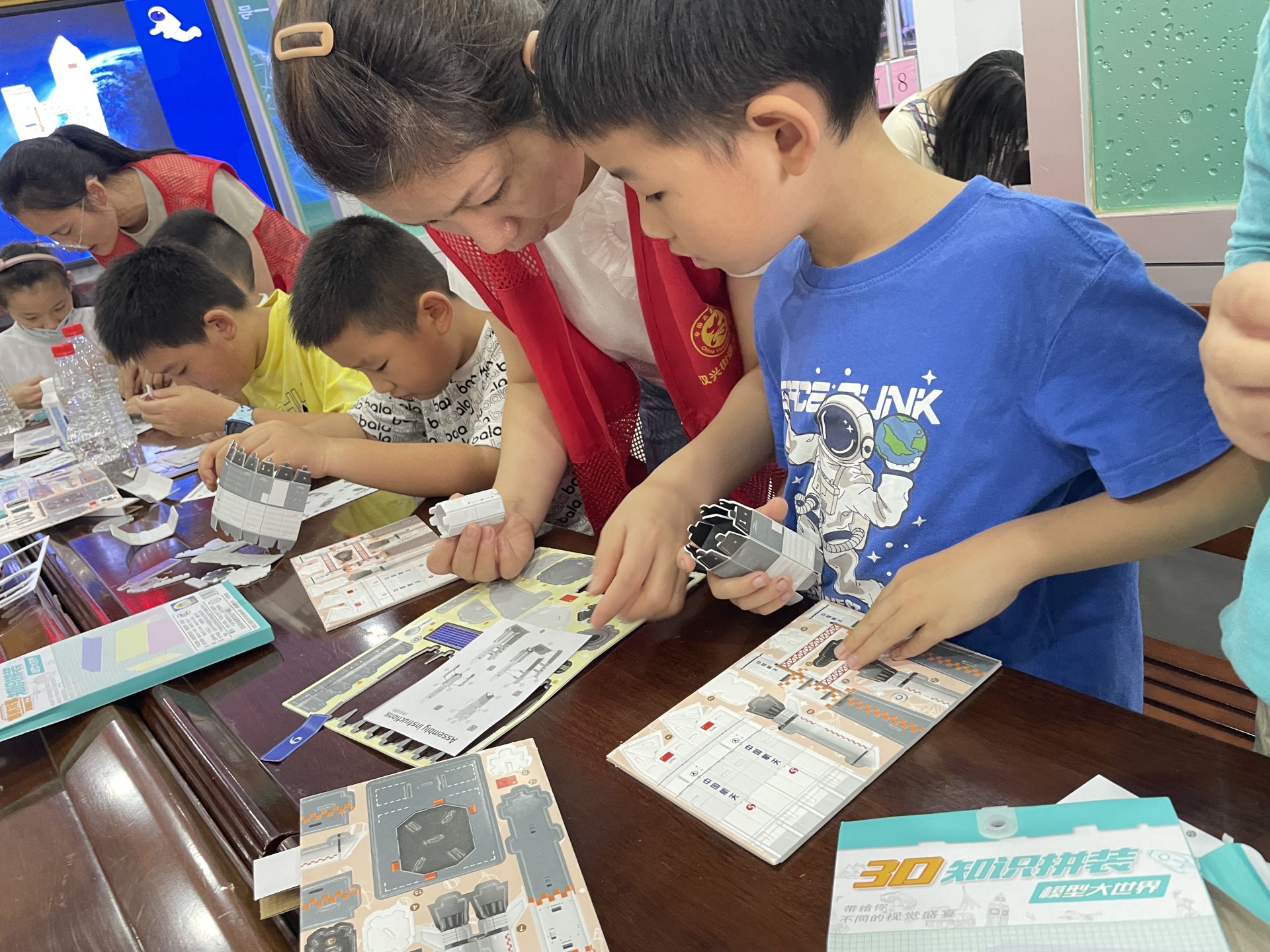 理论讲解完之后,进入了孩子们期待的手工环节。志愿者老师为孩子们发放制作空间站模型的手工材料,带领大家进行立体模型DIY制作,通过动手实践再次“亲近”天宫一号。在志愿者的耐心讲解和手把手帮助下,小朋友们细心剪裁、小心拼装、互相帮助,充分发挥动手能力,不到一小时,一个个造型别致的“微型空间站”就完成了。看到自己的成品,大家一个个成就感十足,纷纷露出灿烂的笑容。