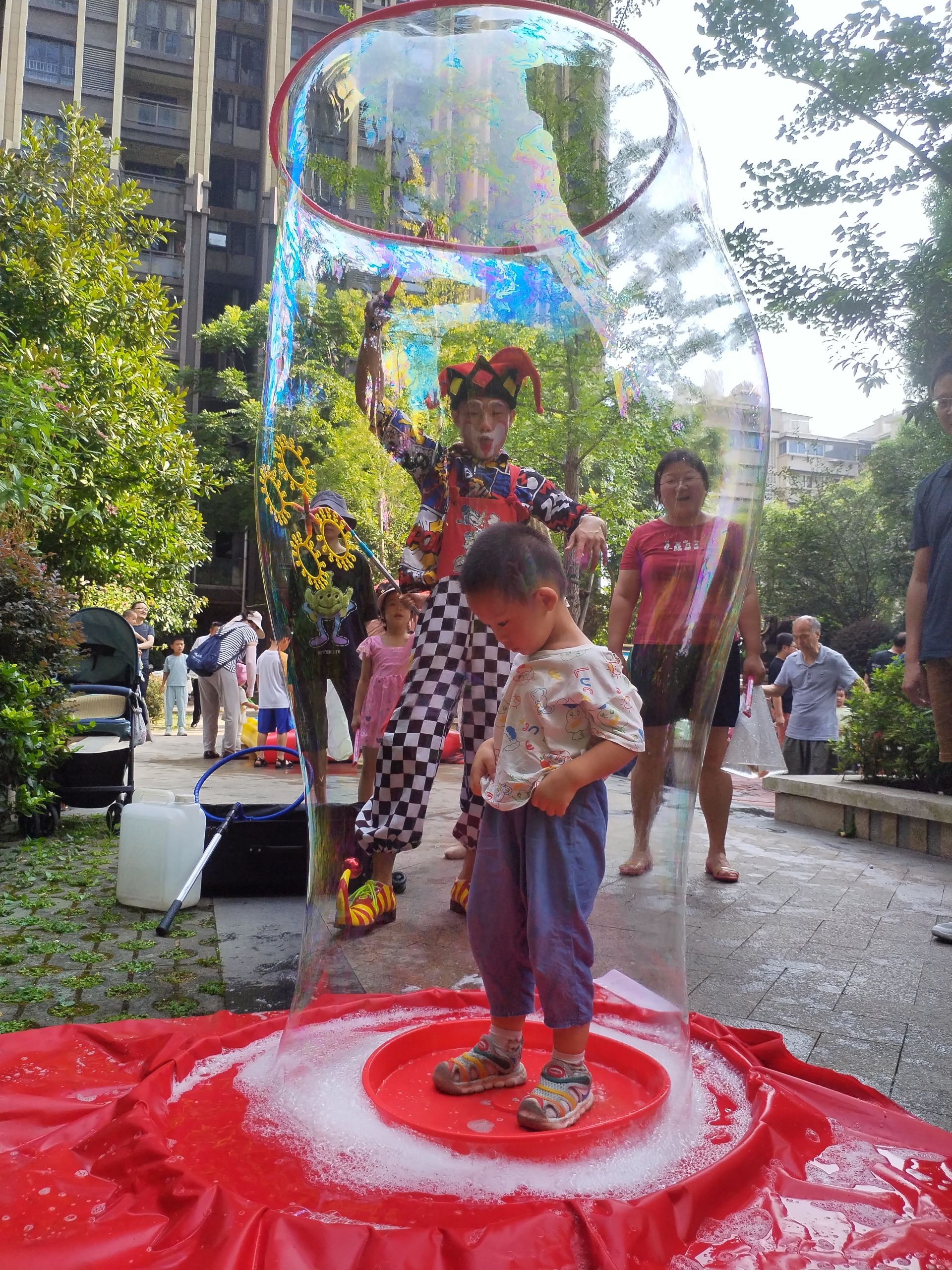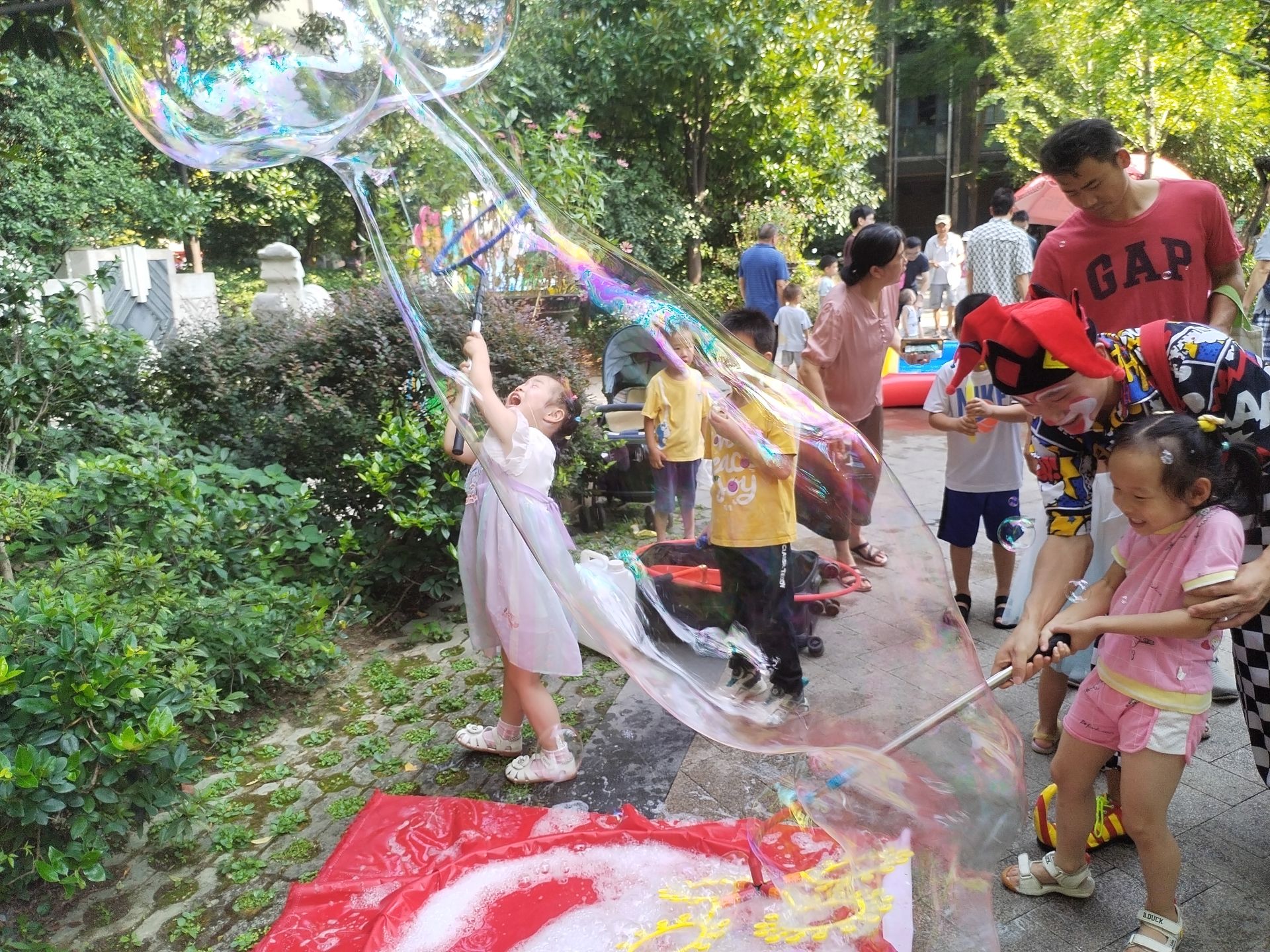 而魔幻泡泡秀,则是孩子们的另一大喜好。五彩斑斓的泡泡飘浮在空中,反射出夏日的光芒。孩子们追逐着泡泡,欢笑声在夏风中飘荡。不远处一对亲子互动玩起了吹高泡泡,场面着实温馨。在欢声笑语中,孩子们与家人一同度过了一个难忘的夏日午后。