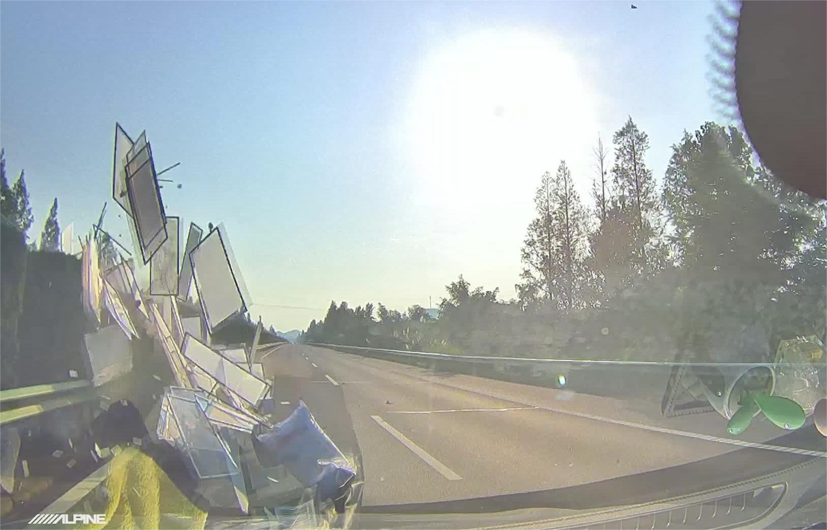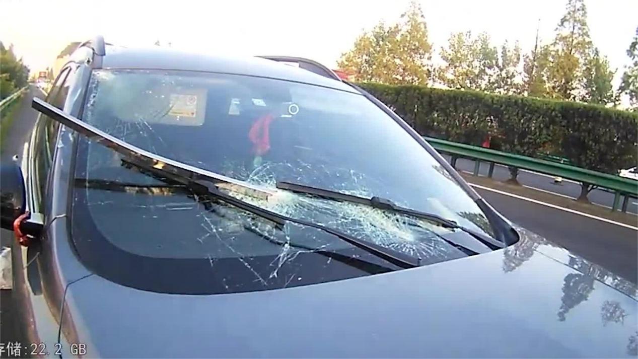 记者从事故车辆的记录仪看到,事发前胡某驾驶小车正行驶在快车道内,突然从中央护栏处飞出一堆货物,胡某来不及避让,货物瞬间砸中了小车车头及前挡风玻璃,导致小车前挡风玻璃碎裂,随后胡某便将车辆停至应急车道并打电话报警。