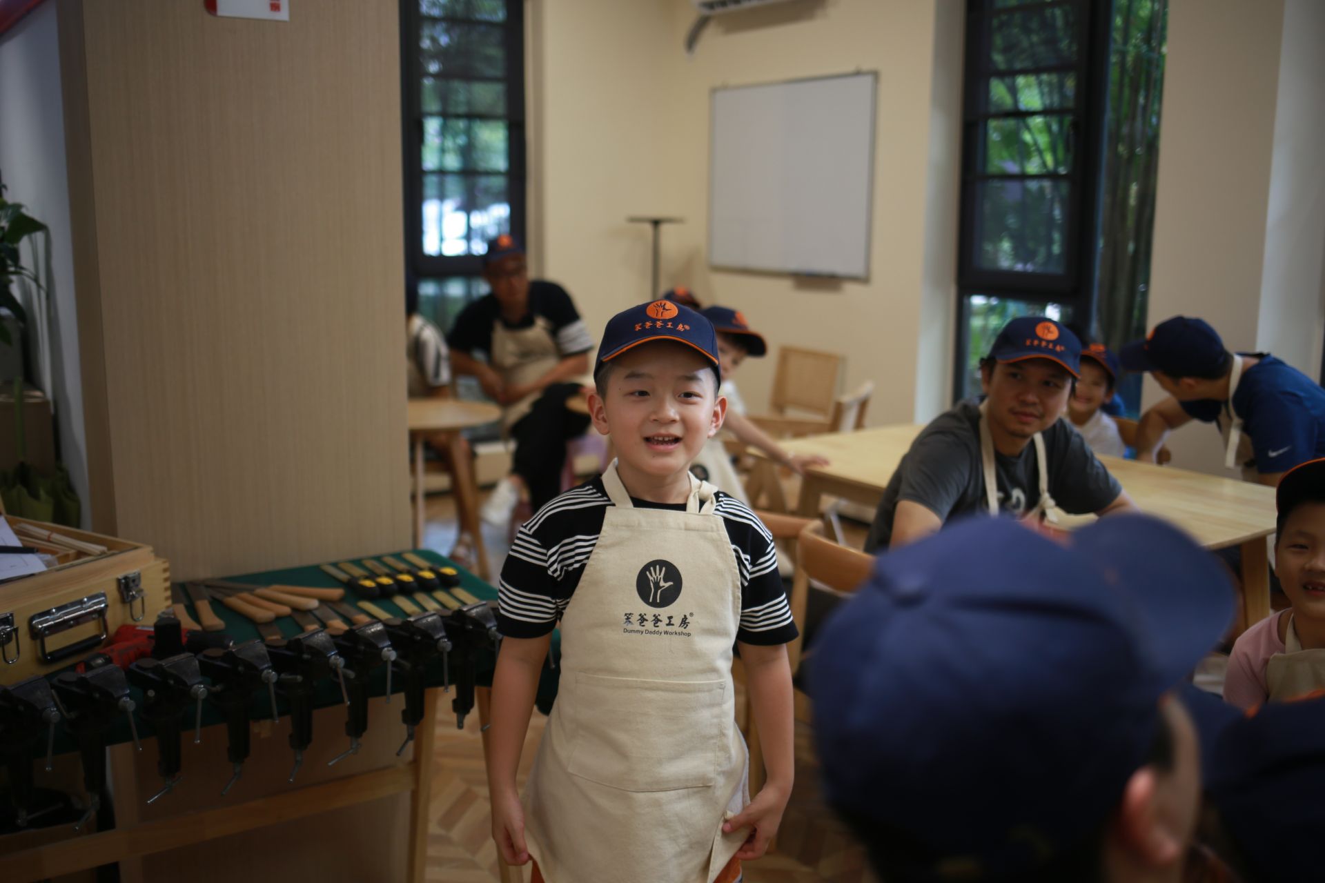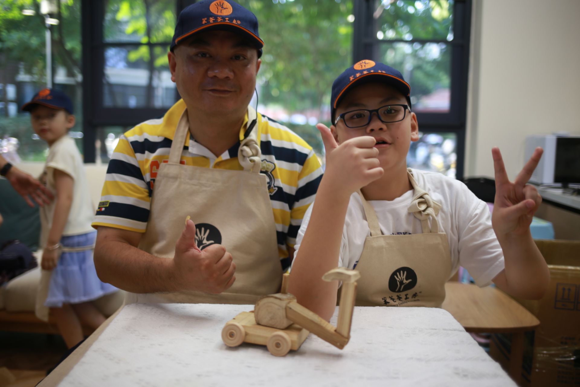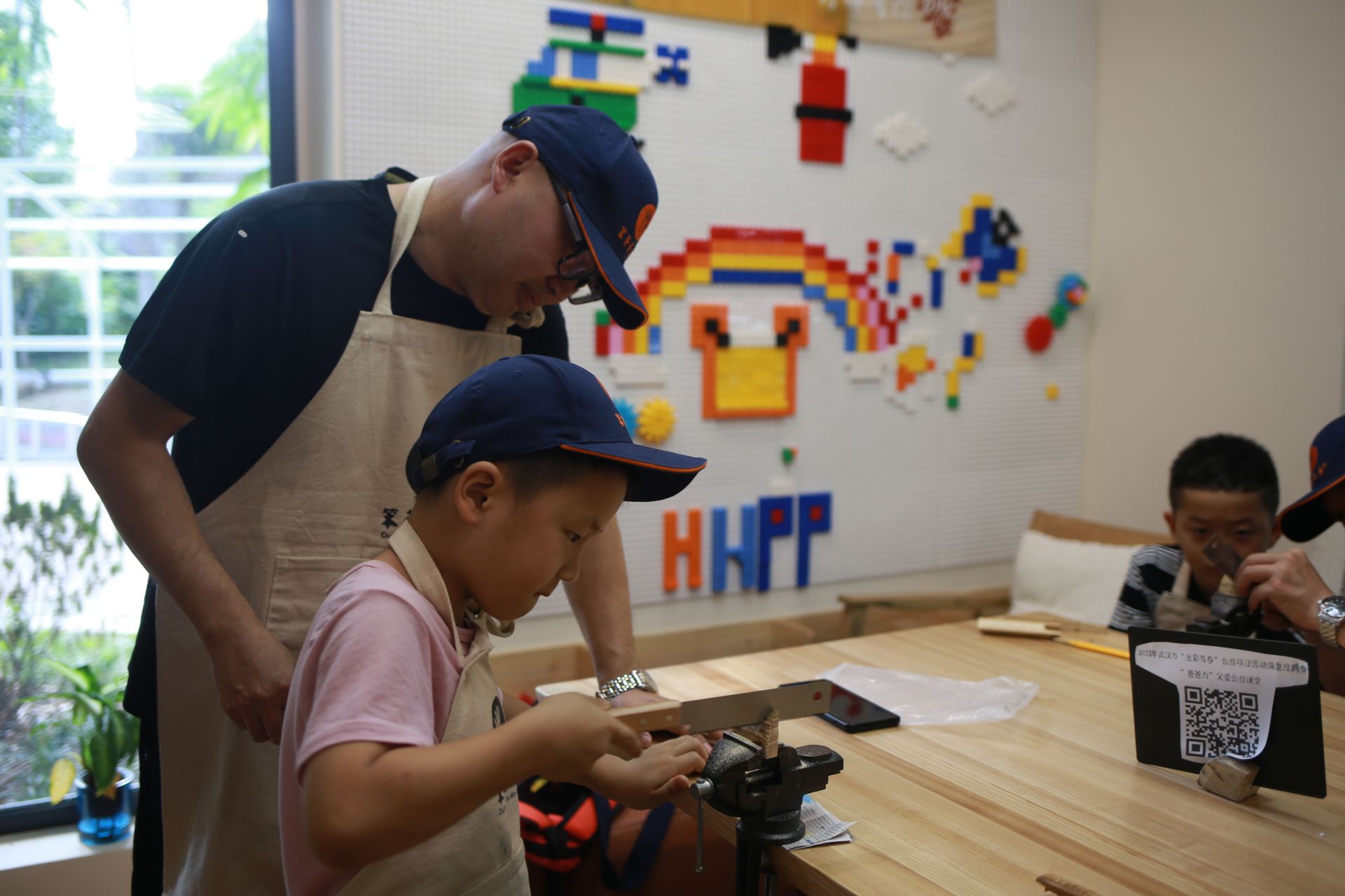 课堂中的木艺作品也是爸爸与孩子们炫耀的资本,木艺手作是最终的作品吗?不是,最终的作品是“父爱”。父爱是通过锯子,矬子,钻子……来传递,在劳动的环境中爸爸们不知不觉的变成了导师,执行者与守护者,课堂结束之后,爸爸们也获得了陪伴的快乐与意义。