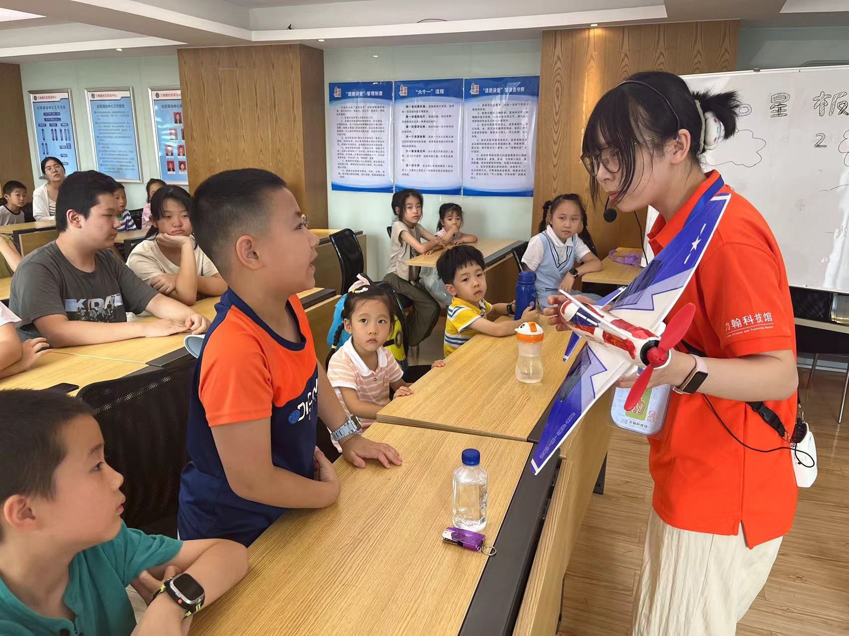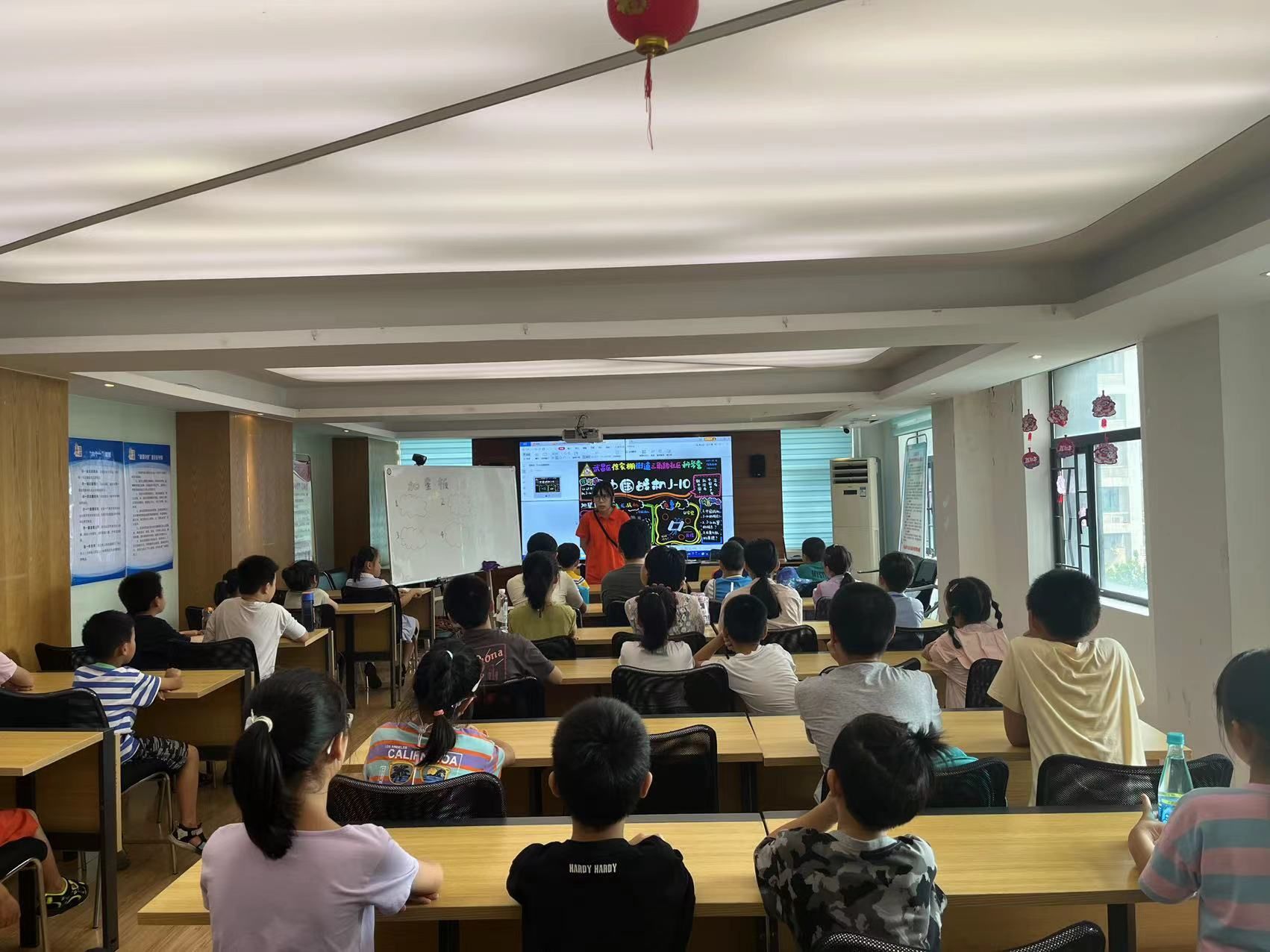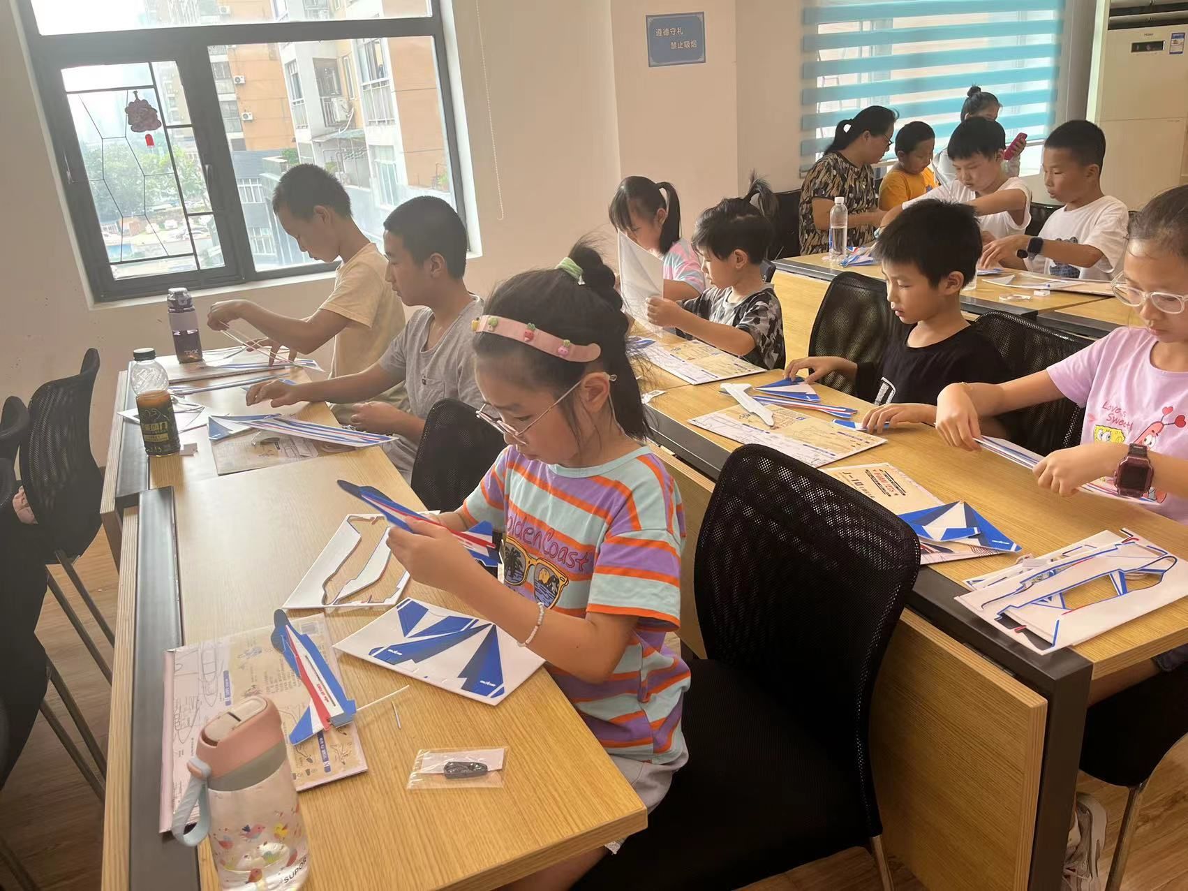 活动现场,老师结合精彩的PPT和视频,给孩子们播放了航模飞行视频,勾起孩子们对航模的好奇心,随后给孩子们展示了飞机的模型,讲解了中国战机造型特点、原理及相关知识,加深孩子对于航空的理解。最后开始孩子们最喜欢的战机手工制作环节,在老师的耐心指导下,一个个战机模型初步形成。