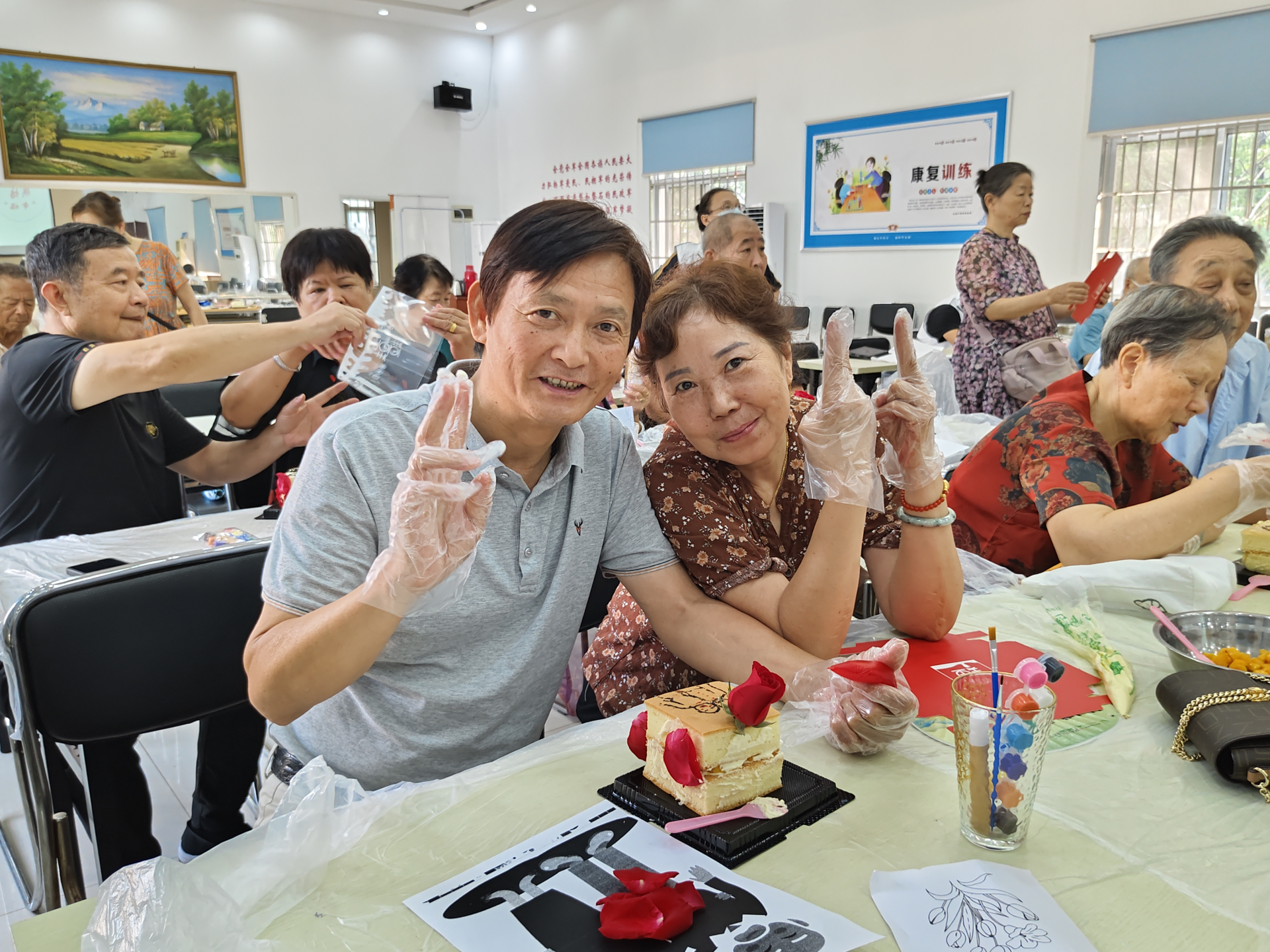 原来,今天活动的主题是需要夫妻两人共同完成的一个蛋糕, 其中设计了两个环节,一是一人手绘卡通蛋糕,寓意“甜蜜”,另一人手绘水杯,寓意“一辈子;二是杯子+蛋糕,寓意“一辈子的甜蜜”,作为礼物赠与夫妻二人。活动还设计了一个环节,15对老年夫妇还和大家分享了与自己另一半相识相知的故事,交流起夫妻相濡以沫的过程、家庭的趣事和生活的窍门。