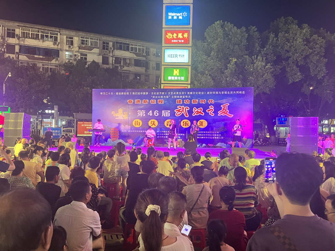 “武汉之夏街头音乐汇”形式新颖,好评如潮。现场有田园社区老年活动中心,妇联协会及其他组织团体开展志愿服务活动,给现场观众分发零食饮料、纸扇桌椅,开展文明行为宣传,为社区居民带去丝丝凉意和欢声笑语。