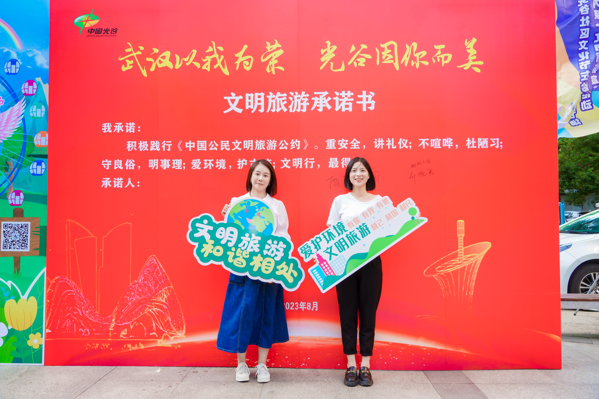 活动现场设置了“武汉以我为荣 光谷因你而美”文明旅游承诺墙,广大市民群众纷纷签名,争做文明旅游的实践者和传播者。活动开始,大家集体观看了“武汉以我为荣”文明旅游宣传片,5家文明旅游单位代表诵读文明旅游倡议书,为文明游光谷代言。活动中还穿插了精心编排的文明旅游文艺节目,展现光谷的人文风貌,2轮文明旅游有奖知识问答,现场观众积极参加,踊跃抢答,将活动氛围推向高潮。