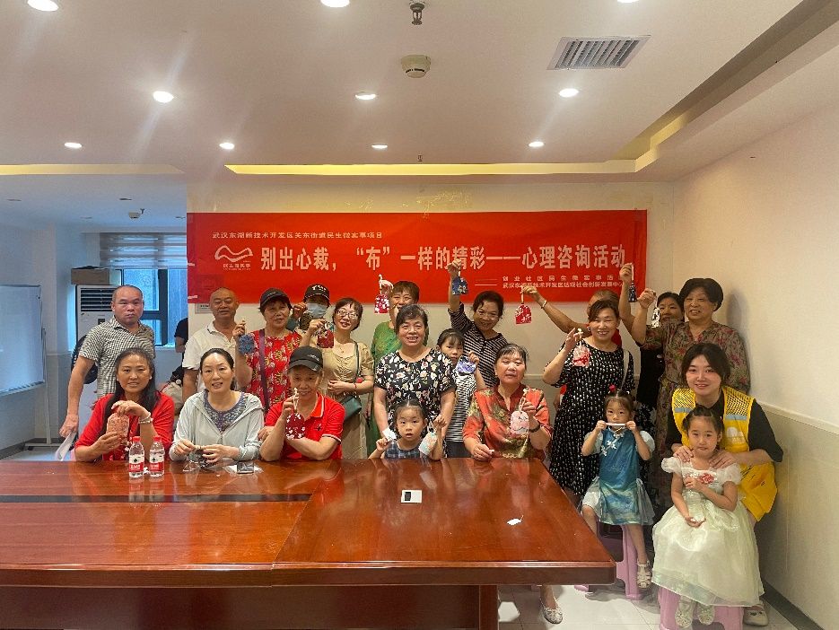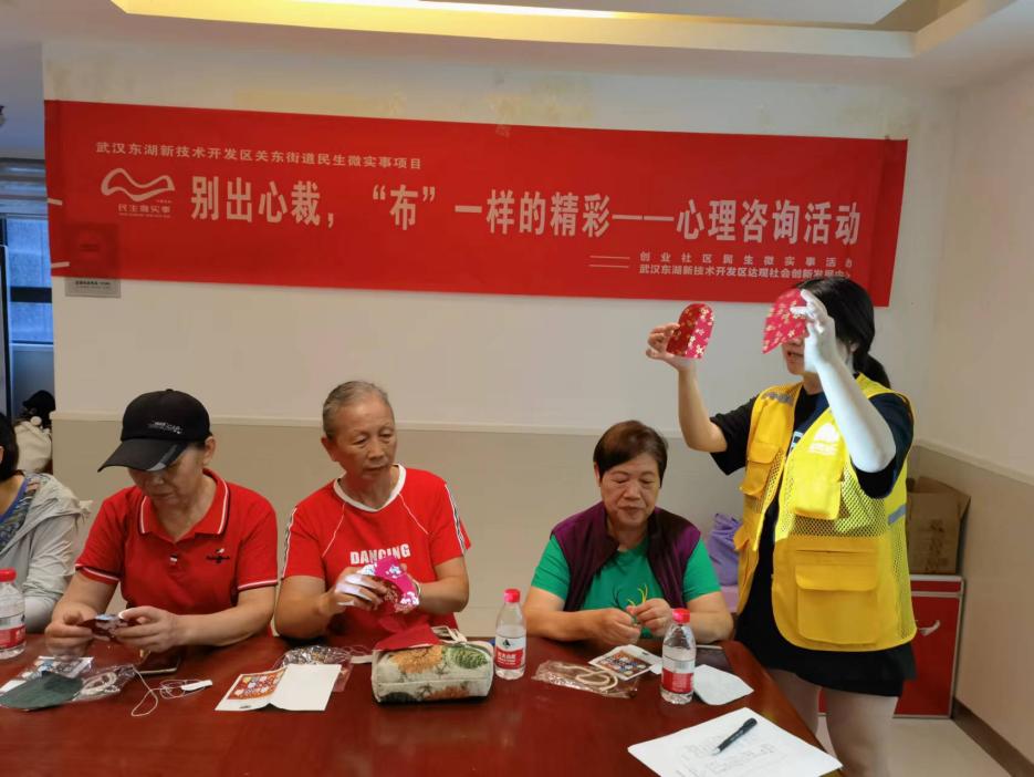 飞针走线,钥匙包里装乾坤;巧手能裁,七彩布上做文章。为让社区居民感受手工制作的乐趣,也为社区居民提供一个放松心情、释放压力的平台,8月24日上午,武汉东湖高新区关东街创业社区联合达观社工在社区会议室开展了一场别开生面的心理咨询活动。本次活动以“别出心裁,‘布’一样的精彩“为主题,共吸引了辖区15名居民积极参与。