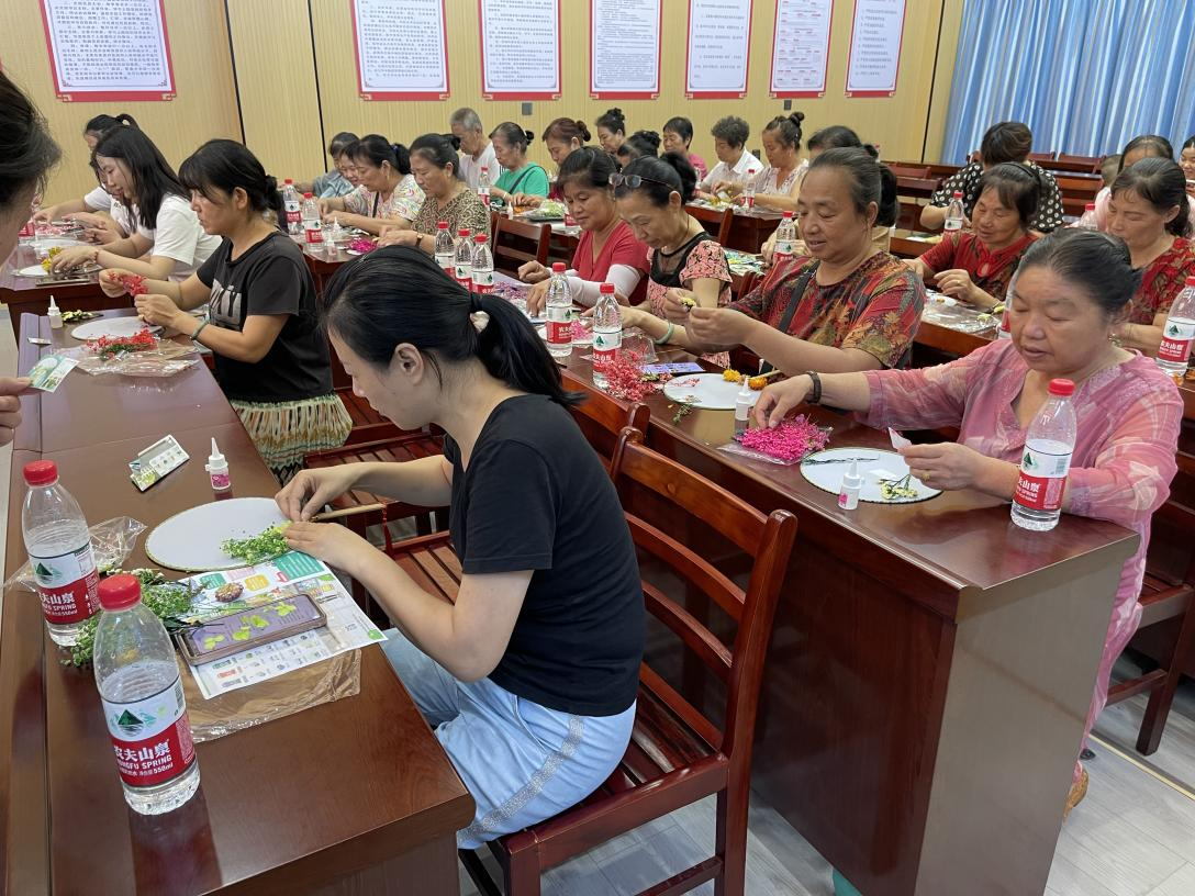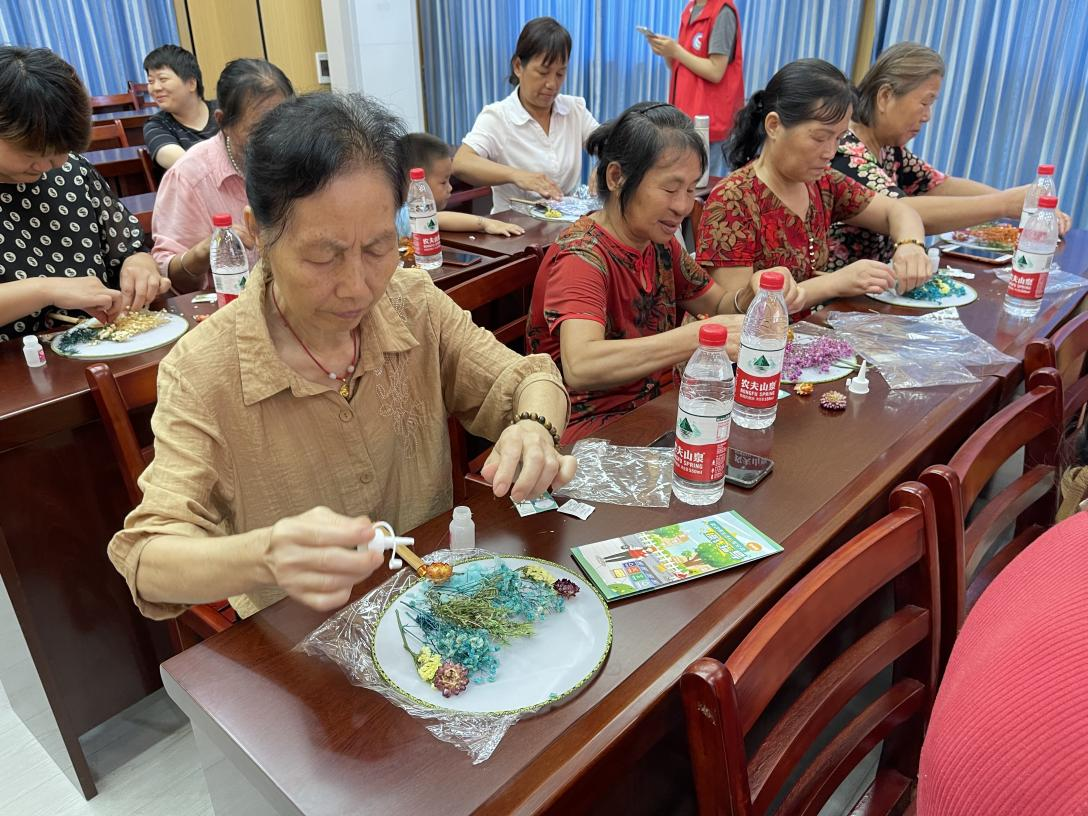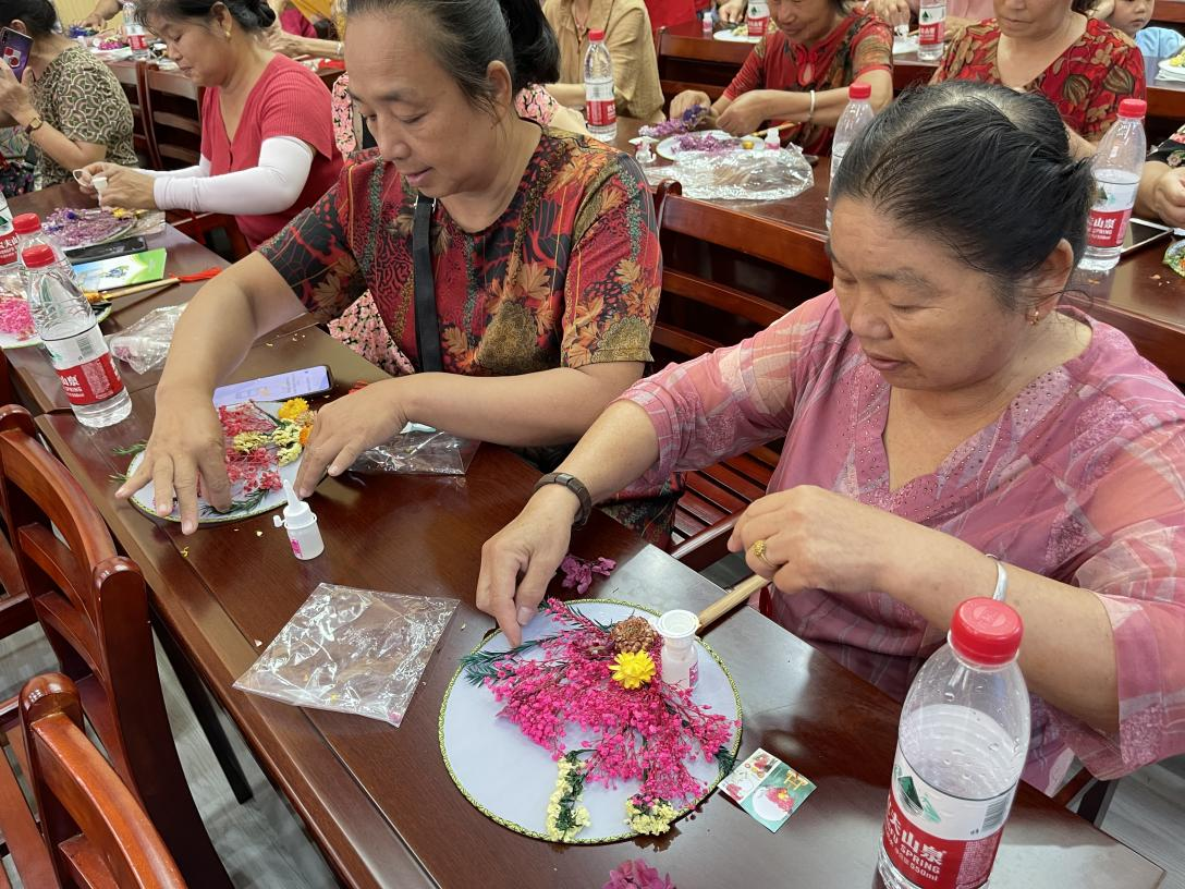 随后居民们纷纷拿起手中的材料,运用自己的创意和想象力,将干花在蒲扇中任意搭配,再用酒精胶水小心翼翼地粘住,固定好干花的位置。在居民们的精心制作下,一面面独特的扇面展现在大家眼前。