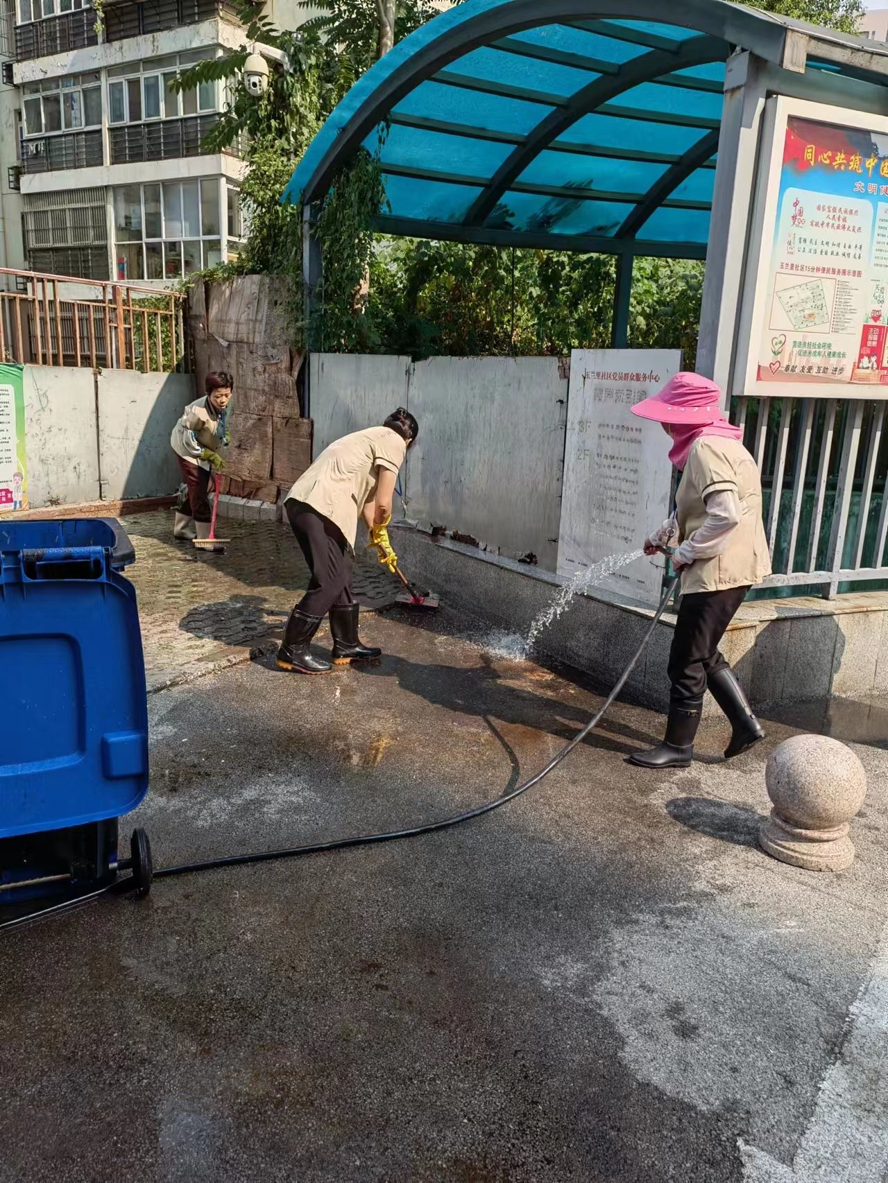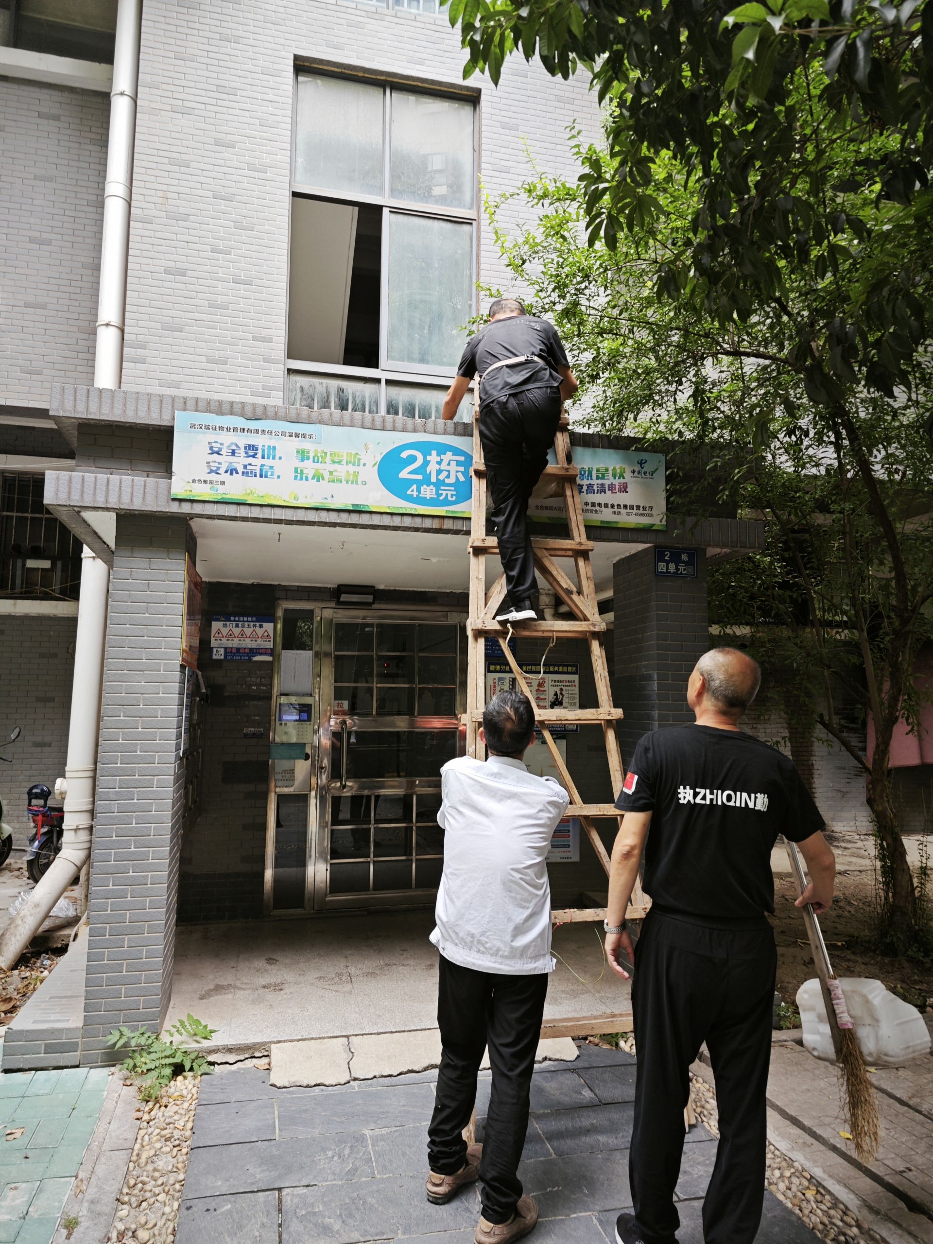 为了清除小区内死角的垃圾,工作人员手中的扫帚、小铲、铁锹等工具齐上阵,有的工作人员搭梯爬上单元门平台将不易清理的角落进行处理,有的工作人员连接水管将地上的油污清洗干净,有的人将长夹伸入草丛中将纸屑、垃圾袋等杂物夹出,还有的人将小区里的广告宣传栏、公共座椅、公共健身器擦拭干净。