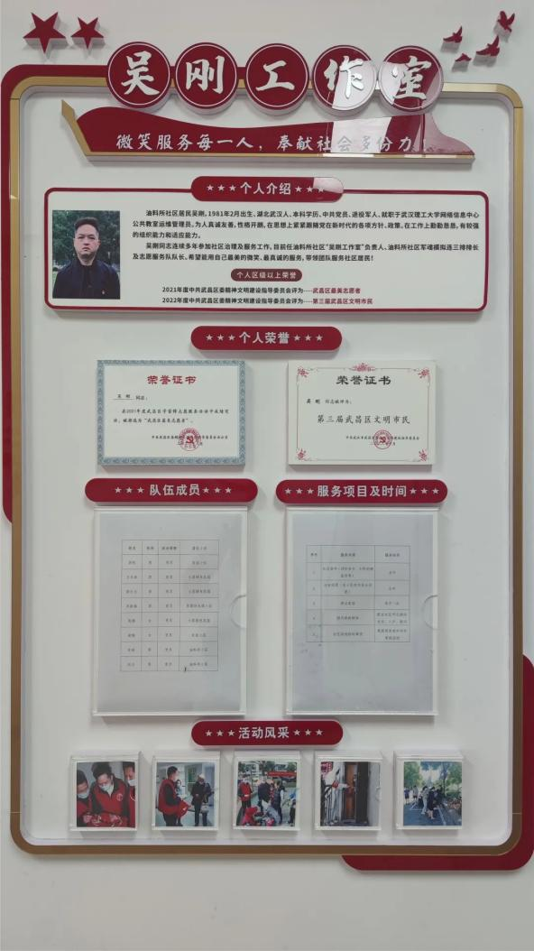 吴刚是油料所社区友谊小区居民,也是社区退役军人志愿服务队的队长,曾获得武昌区最美志愿者、武昌区文明市民等荣誉称号。他经常说“作为一名退役军人,要时刻保持军人本色!”由他组织成立的退役军人志愿服务队,坚持常态化开展消防安全入户宣传、小区治安巡逻、清洁家园等活动,与社区困难家庭进行结对帮扶,用实际行动诠释着入伍那天许下的“全心全意为人民服务”的铮铮誓言。为激励吴刚同志发挥头雁作用,带动更多的居民参与社区治理,油料所社区在社区党群服务中心挂牌成立了“吴刚工作室”。工作室成立以来,组织策划了“安全我先行”“助力营商环境”等多个主题活动,成为社区共建共治共享的策源地之一。