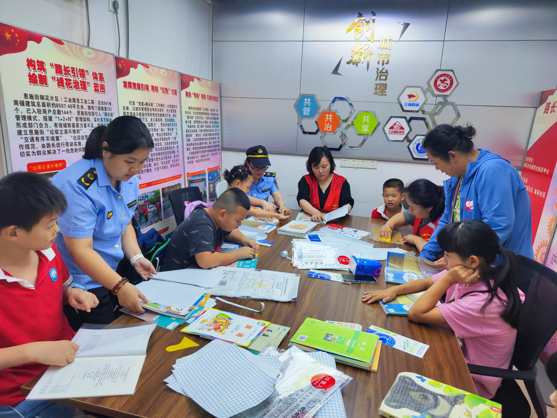 8月30日下午,武汉市青山区钢花村街道114社区志愿者和恩施街的路长们带领商铺流动人口子女们一起在恩施街管委会内包起了新书,小朋友们兴高采烈地给自己的新书穿上了漂亮的“衣裳”。