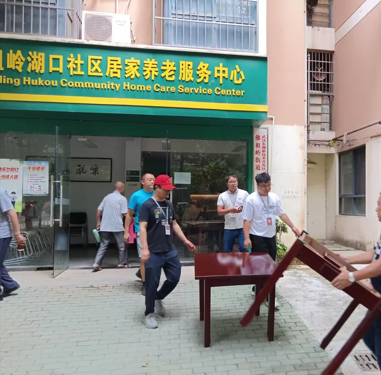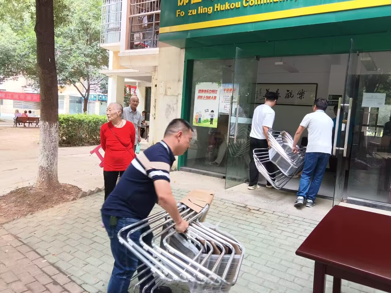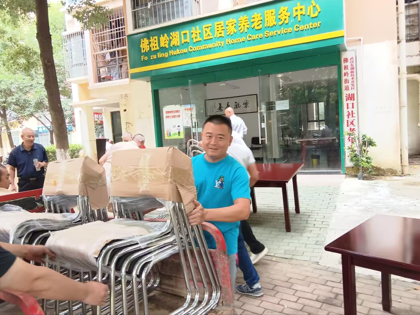 “快来看,新桌子椅子来了!”循着孙中望老人的声音,大家纷纷朝养老服务中心门口看去。武汉东湖新技术开发区佛祖岭街道湖口社区党委书记肖平及社区第三支部党员姚浩带领一群身戴社区工牌的工作人员正在热火朝天地从车上卸下桌椅,朝养老服务中心搬去。