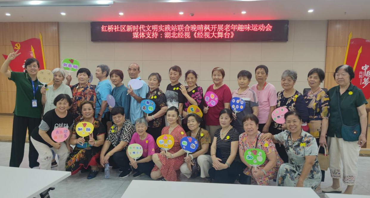 为丰富老年人的文化体育生活,增强老年人身体素质,展现新时代老年人热爱生活、蓬勃向上的精神风貌,8月31号上午,武汉市江岸区花桥街道红桥社区新时代文明实践站联合湖北经视《经视大舞台》与晚晴枫居家养老,开展“我运动·我健康”为宗旨的老年趣味运动会,活动吸引了近40多位社区老年居民到场参与活动。