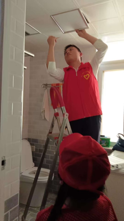 “阿姨,灯帮您修好了,您开灯试试看。”党员志愿者带上新的LED平板灯换下了坏掉的灯,打开开关,整个卫生间瞬间明亮起来。灯修好了,李阿姨的心里也觉得亮堂堂。