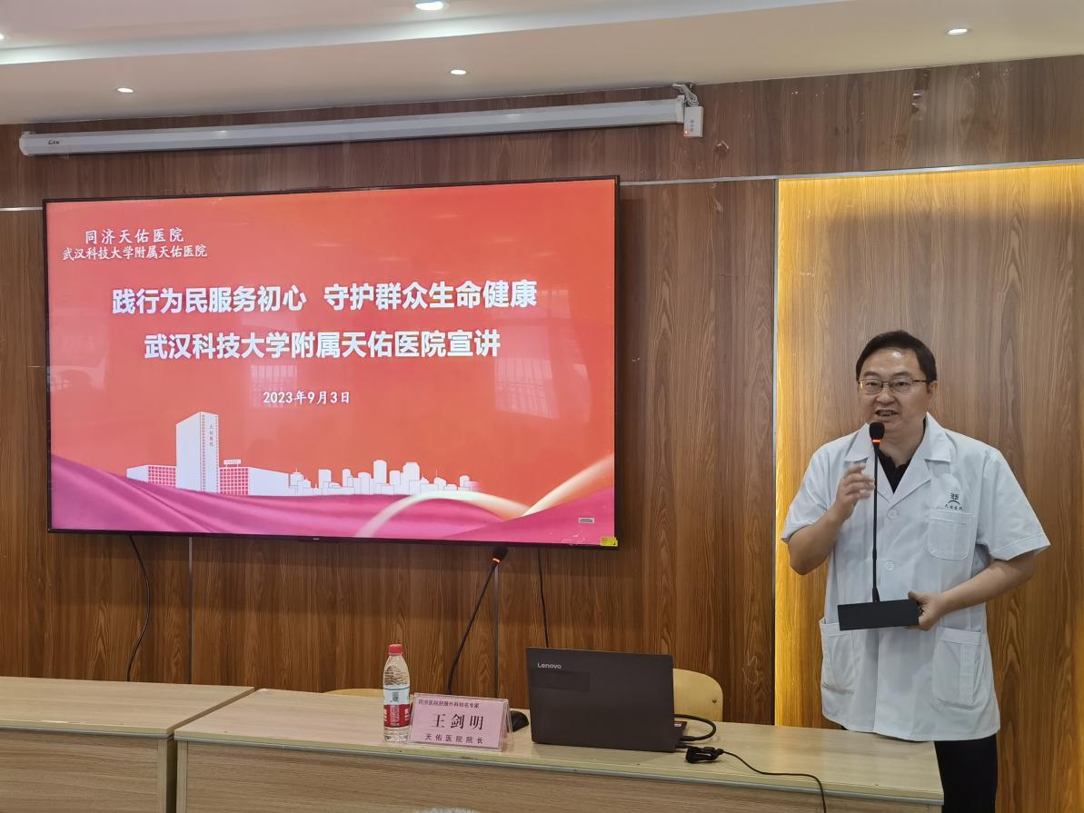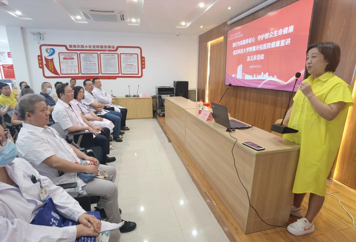 为了使此次义诊活动服务更多的群众,天佑医院和涂家岭社区的工作人员前期通过微信群、电话、走访等进行广泛宣传。早上九点,武昌区人大代表、天佑医院院长、二级教授、主任医师王剑明教授,带领着天佑医院心血管内科,内分泌科,康复医学科,中西医结合科,神经内科众多主任医师来到涂家岭社区银海花园,在宣讲会上,王院长表示:”天佑医院作为涂家岭社区的“邻居”,我作为人大代表,践行着“双重使命”,一方面要时时不忘“以病人为中心”,认真倾听患者心声,保持与群众的密切联系,为病人排忧解难;另一方面也要致力于医院医疗水平和服务能力的提升,不断改善办院条件,从而用高尚的医德、高超的医术更好地回馈大众,进一步增强群众的获得感和幸福感!”