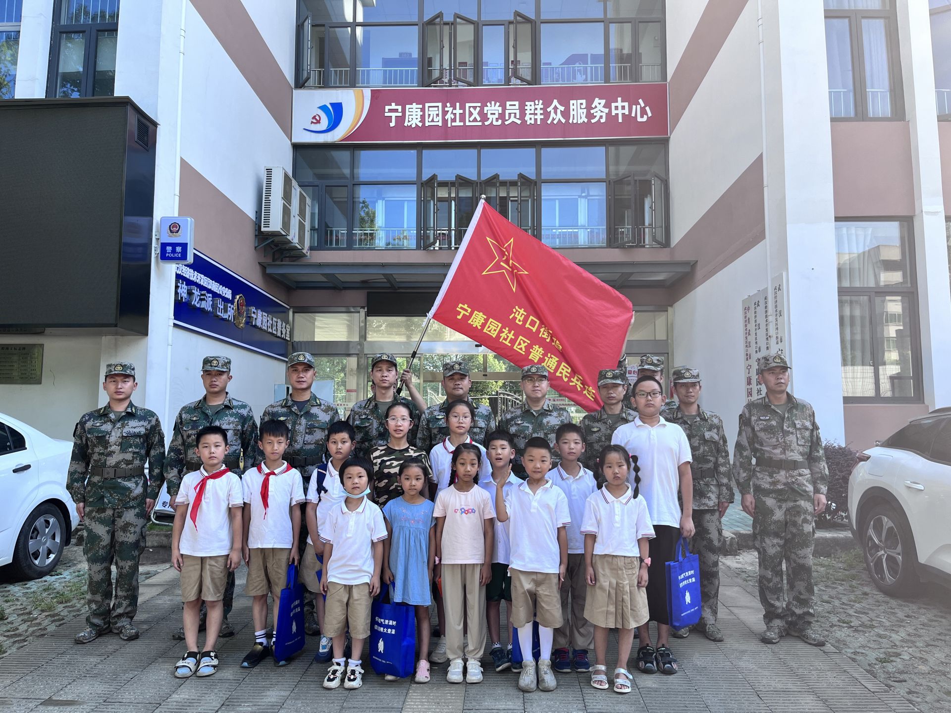 “稍息、立正、齐步走!”伴随着铿锵有力的口令声,沌口街道民兵应急排的民兵们迈着整齐划一、威风凛凛的步伐迎面走来。“我们就是想用队列行军展示,以最直观的方式向孩子们展现军人风采,激发强军爱国热忱,让大家从小就树立起心系国防的强军思想。”沌口街道武装部工作人员李卓向家长们讲道。休息间隙,民兵连战友们来到孩子们身边,给大家展示起自己在部队所学的拿手绝活。