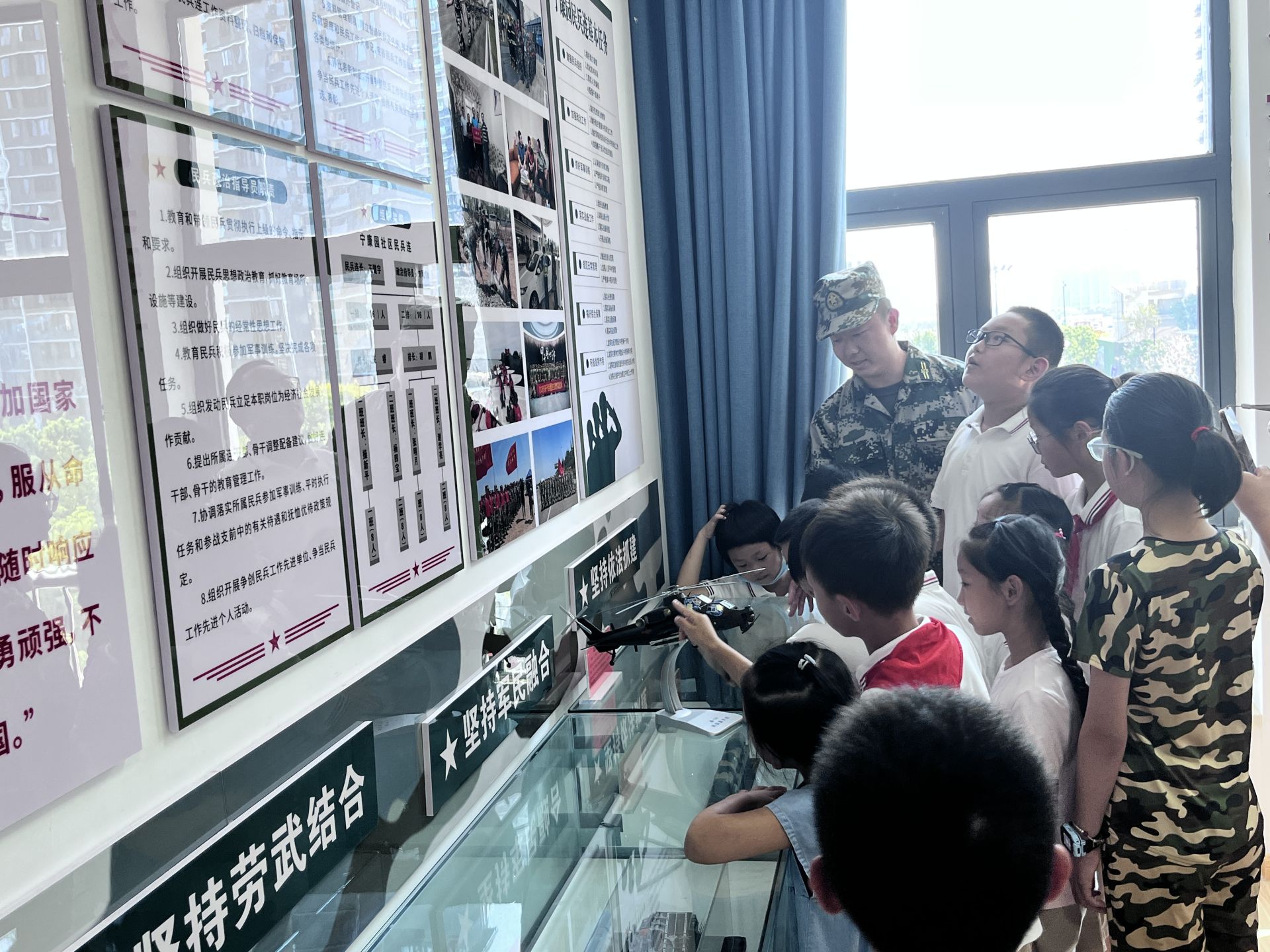 队列展示结束后,宁康园社区副书记同时也是一名退役军人的王健宇,带领孩子们参观了社区民兵之家,结合自身部队经历声情并茂的向大家讲解展柜里的武器装备。“这是辽宁舰,是我们国家第一艘服役的航空母舰,向西方列强展示了中国海军有能力走向深蓝。”“这个模型是歼20,是我们国家自主研制的第五代隐身战斗机……”交流互动环节,对于自己感兴趣或者不懂的知识,孩子们积极举手提问,民兵应急连的民兵们都一一耐心解答。