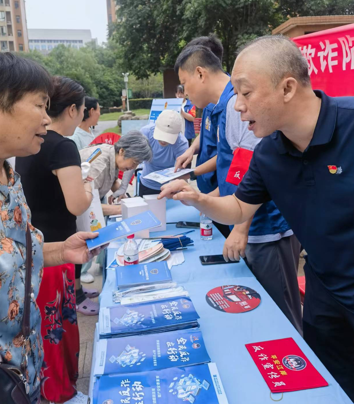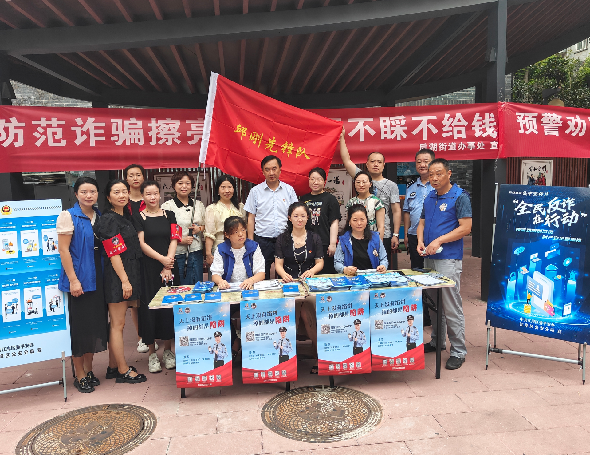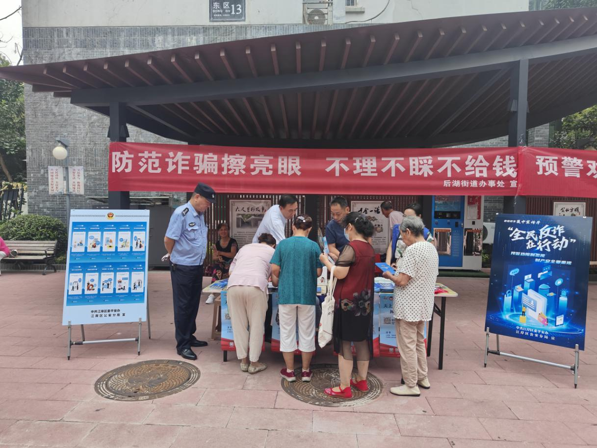 活动当天,江岸区委平安办“政法先锋队”联合区公安分局、后湖街道,深入美庐社区,在青青美庐小区法治长廊和圣诚和园小区广场分别设置宣传点,开展反电信网络诈骗宣传。通过现场讲解、设置反诈主题宣传展板、发放宣传资料等多种形式,向居民宣传反诈防骗知识。
