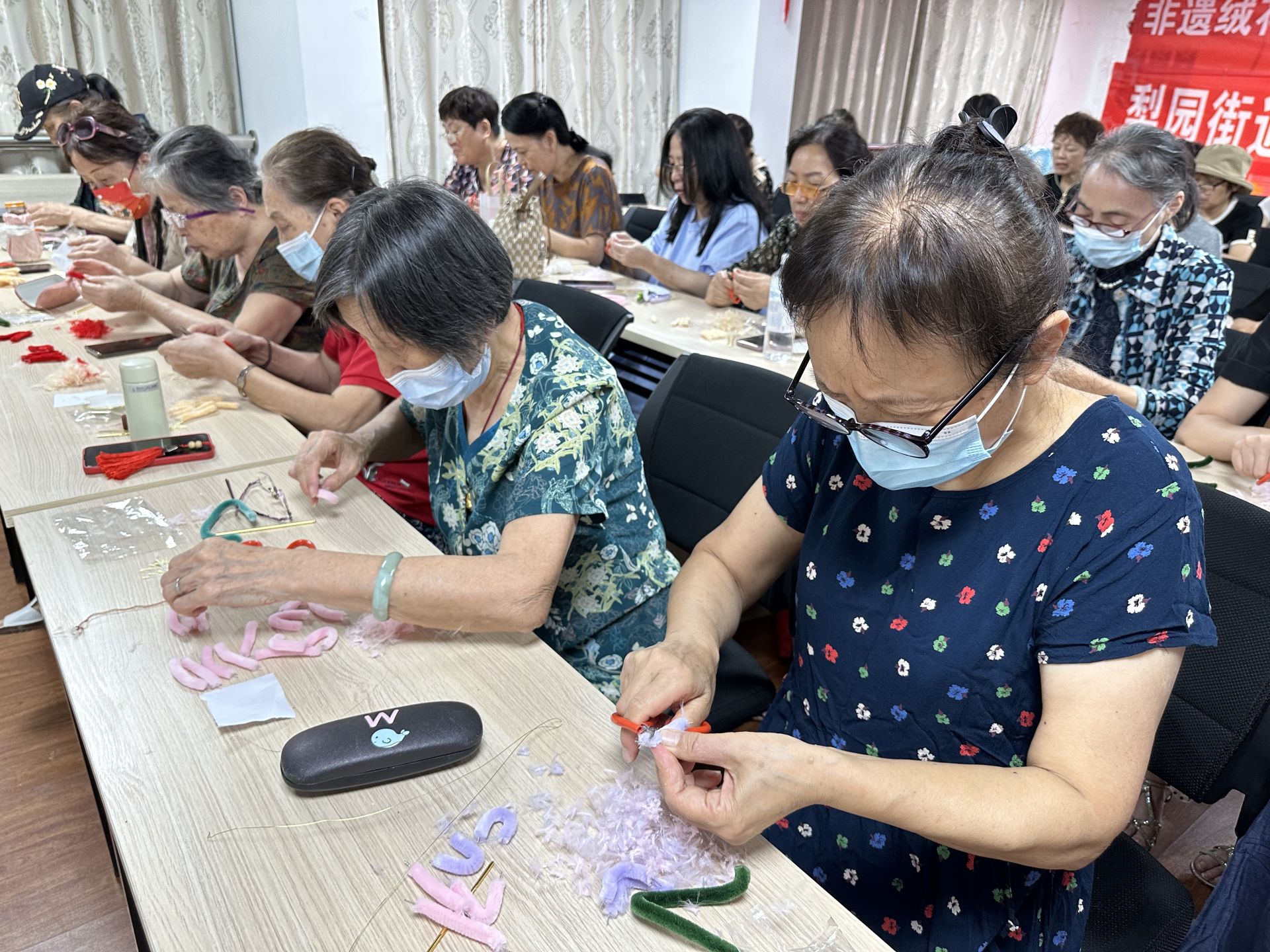 活动现场,老师向居民们讲解了绒花的历史文化及制作工艺,接着在老师的指导下,大家挥动手中的剪刀和铜丝线,小心翼翼地塑造着自己的绒花发簪,每一步都需要精准的剪裁和巧妙的组合,挑战着大家的手工巧思。随着活动的进行,发簪们逐渐成形,有桃花款、蝴蝶款、菊花款等多种款式,每一枚发簪都是居民们心血的结晶,大家欣赏着自己的作品,感受到制作的成就感和对传统文化的尊重。