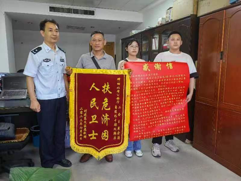 6月29日早上6时许,一位白发老人横躺在省公安厅西院离退休干部处门外的长椅上,晨跑的机关工会主席余涛发现异常,便立刻停下脚步走上前,连喊几遍老人没有一点反应,当时过往行人很少,都不认识老人,看着脸颊、手臂被蚊子叮咬红肿,脉博、呼吸微弱的老人,他敏锐地意识到老人可能突发重病,情况危急,必须尽快找到其家人、尽快送医抢救。从婆婆身子压着的袋子里,他找到老人的手机,从通话记录里拨打了一个经常出现的号码,通知他们火速赶到。离退休干部处三级主任科员韩华路过,也迅速加入救援,从办公室找出速效救心丸帮老人服用。很快,老人的家人从厅外赶到,120救护车迅速将病人送医。老人在昏迷一天后,经抢救和精心治疗,于7月4日康复出院。事后得知,老人当天一早出门突发脑梗,万幸抢救及时,得以脱离生命危险。老人的儿子刘建东多方打听,问到两位警官的姓名。7月5日,刘建东携子女专程到公安厅,向余涛、韩华同志送上“扶危济困 人民卫士”锦旗和感谢信。