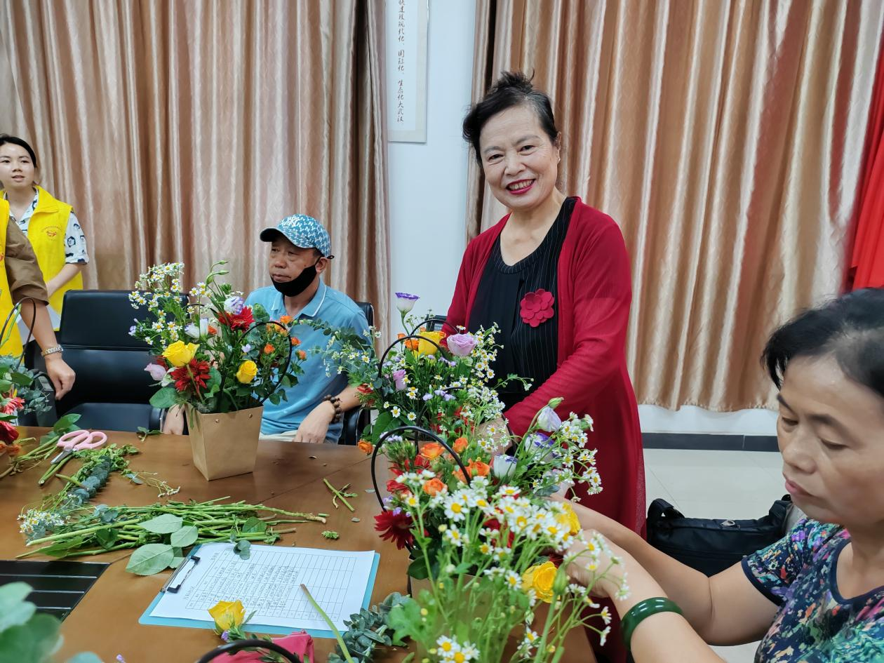 “大家看到我手里的花,我们可以先把花篮的四角先插上花。”一朵朵花在花艺老师的手里变成了一个美丽的小花篮。居民们也跟着老师的动作一起让花朵在花篮里竞相开放。活动现场花艺老师逐个指导了每个作品,有的作品花团锦簇,有的作品简洁大方,有的作品精致细腻,花朵的美在不同的巧手下,展现了不同的浪漫。