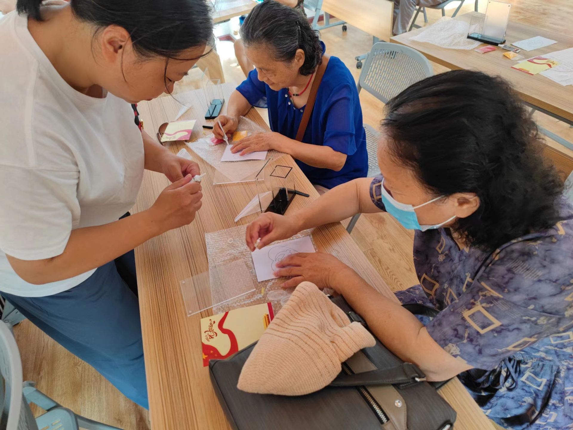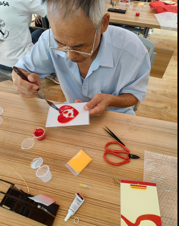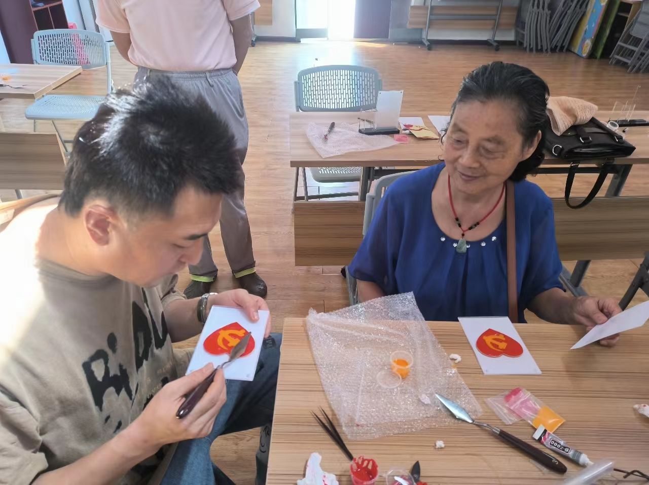 随后,社区党员们参与了一场充满活力的红色精神手作。党员们将红色元素——党徽,融入了手工制作中,他们将细软的铜丝当作画笔,用红色和黄色的彩砂填充出一个个“爱心包裹着党徽”的图案。党员们互相协助,分享技巧,最终,精美的掐丝珐琅“党在我心”的作品呈现在大家眼前,党员们脸上也流露出满意的笑容。