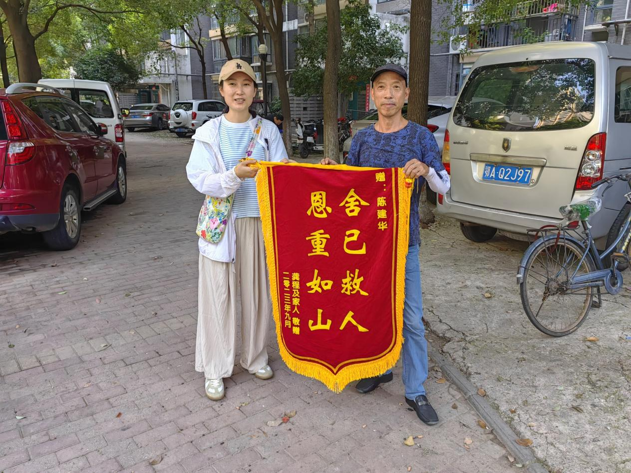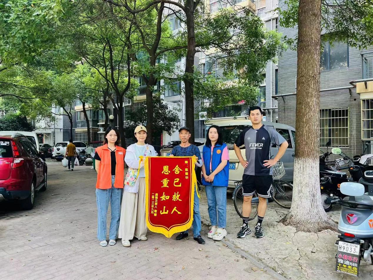 9月7日,程女士来到武汉市汉阳区江堤街道三里民居社区,为辖区居民陈师傅送上锦旗,感谢其见义勇为的行为。