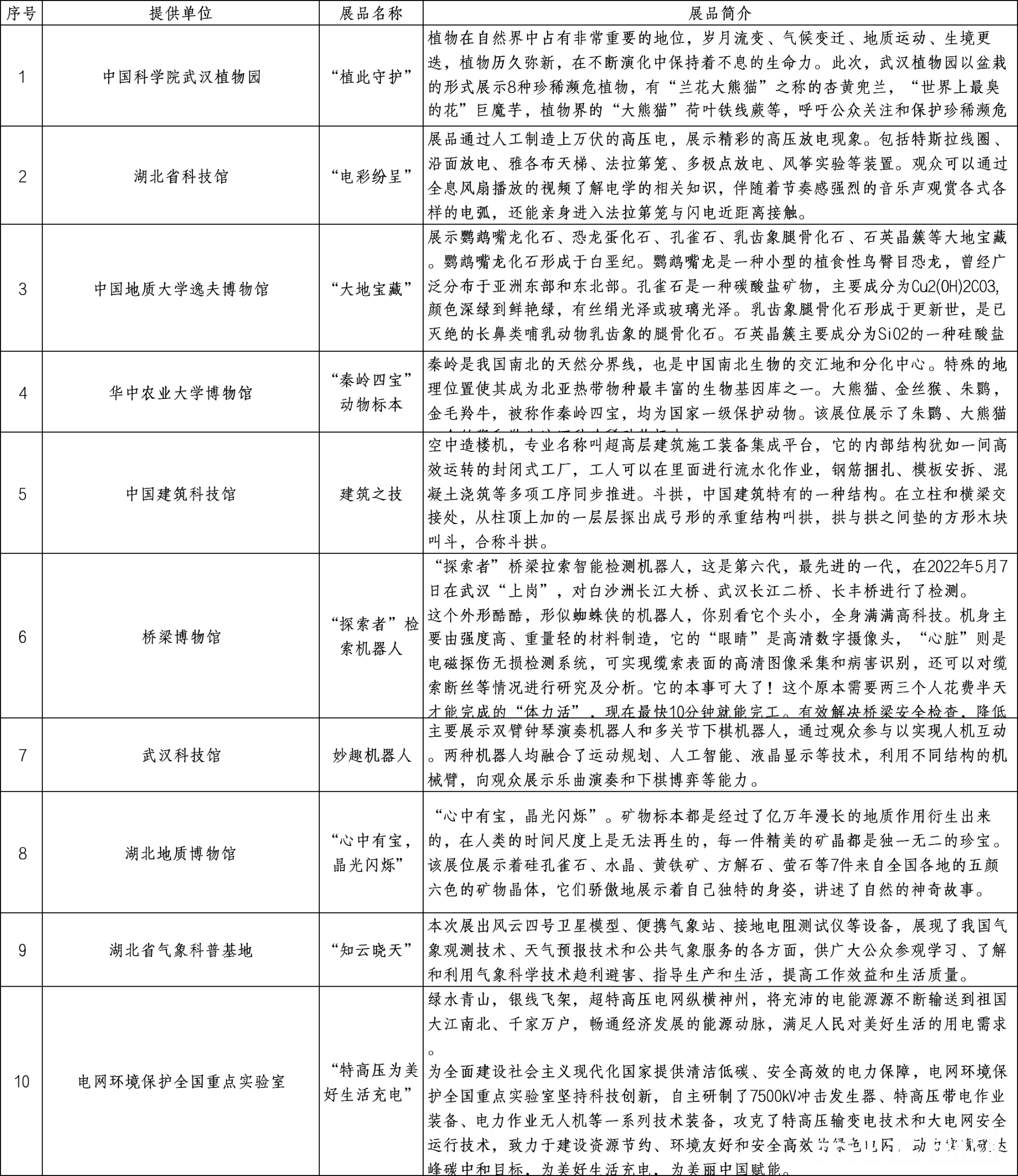 本次亮宝会以“心中最靓的宝”为主题,湖北举全省科普资源之力,汇聚各科普教育基地代表性馆藏宝贝,中国科学院武汉植物园、湖北省科技馆、中国地质大学逸夫博物馆、华中农业大学博物馆、中国建筑科技馆、桥梁博物馆、武汉科技馆、湖北地质博物馆、湖北省气象科普基地、中国电力科学研究院有限公司武汉分院十大科普教育基地纷纷亮出“镇馆之宝”或特色展品:展示动人大地物语的矿物晶体,融合高超技术与艺术美学的斗拱,酷似“蜘蛛侠”的桥梁拉索智能检测机器人、展示中国智慧和建筑技术的空中造楼机,“知云晓天”的气息卫星模型,珍稀濒危的“植物界大熊猫”荷叶铁线蕨,一大波展品将集中展示我国在气象、生态、地质、建筑、电力等领域的科技成果和科普知识。