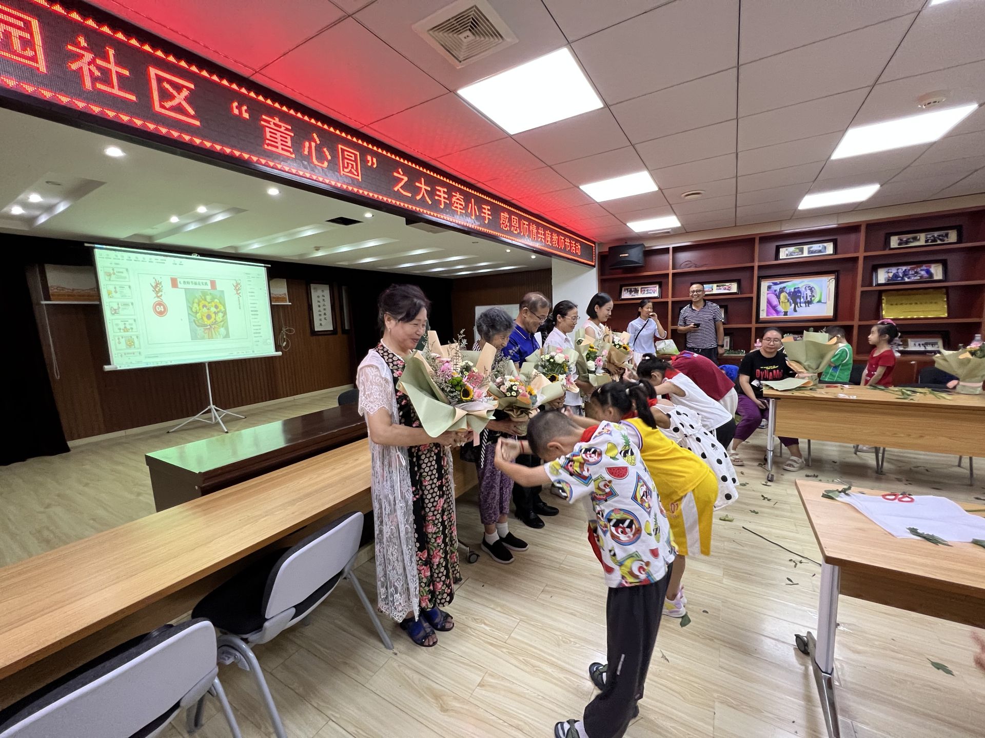 活动到了最后一个献花行礼的环节——一场温馨而又独特的教师节“束脩之礼”。社区特地邀请了五位教师和五名红领巾学生代表上台。在热烈的掌声中,学生们向老师们献上精心插制的花束,展现出深深的感恩之情。教师们也非常感动,接受了学生们的祝福,回馈他们亲切的微笑。随后,大家合影留念,记录下这个特殊时刻。教师节插花活动在感恩与亲情的氛围中圆满结束,留下了美好的回忆。