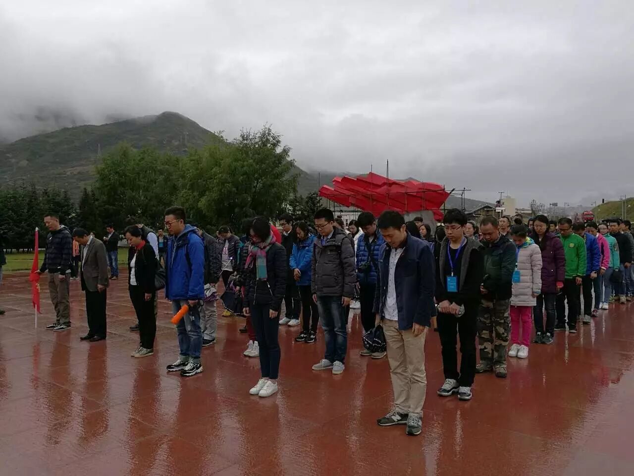 采访行程的最后一天,记者编辑们的高原反应还没有消失,就迎来了更加恶劣的天气,阴云密布、细雨连绵。他们在雨中脱帽、收伞、立正,在长征纪念碑前,向革命先烈默哀、鞠躬、献花,并参观红军长征纪念馆。