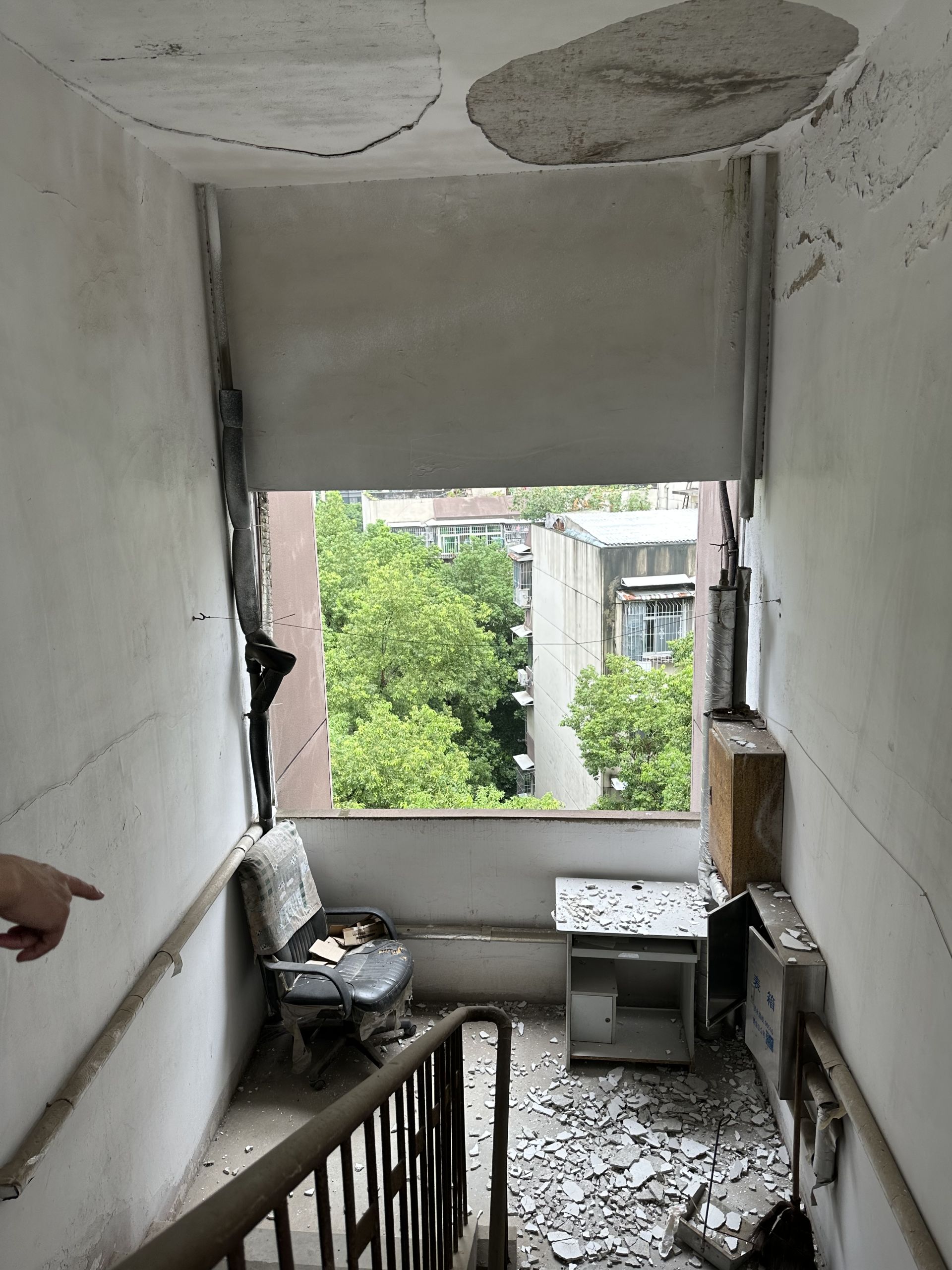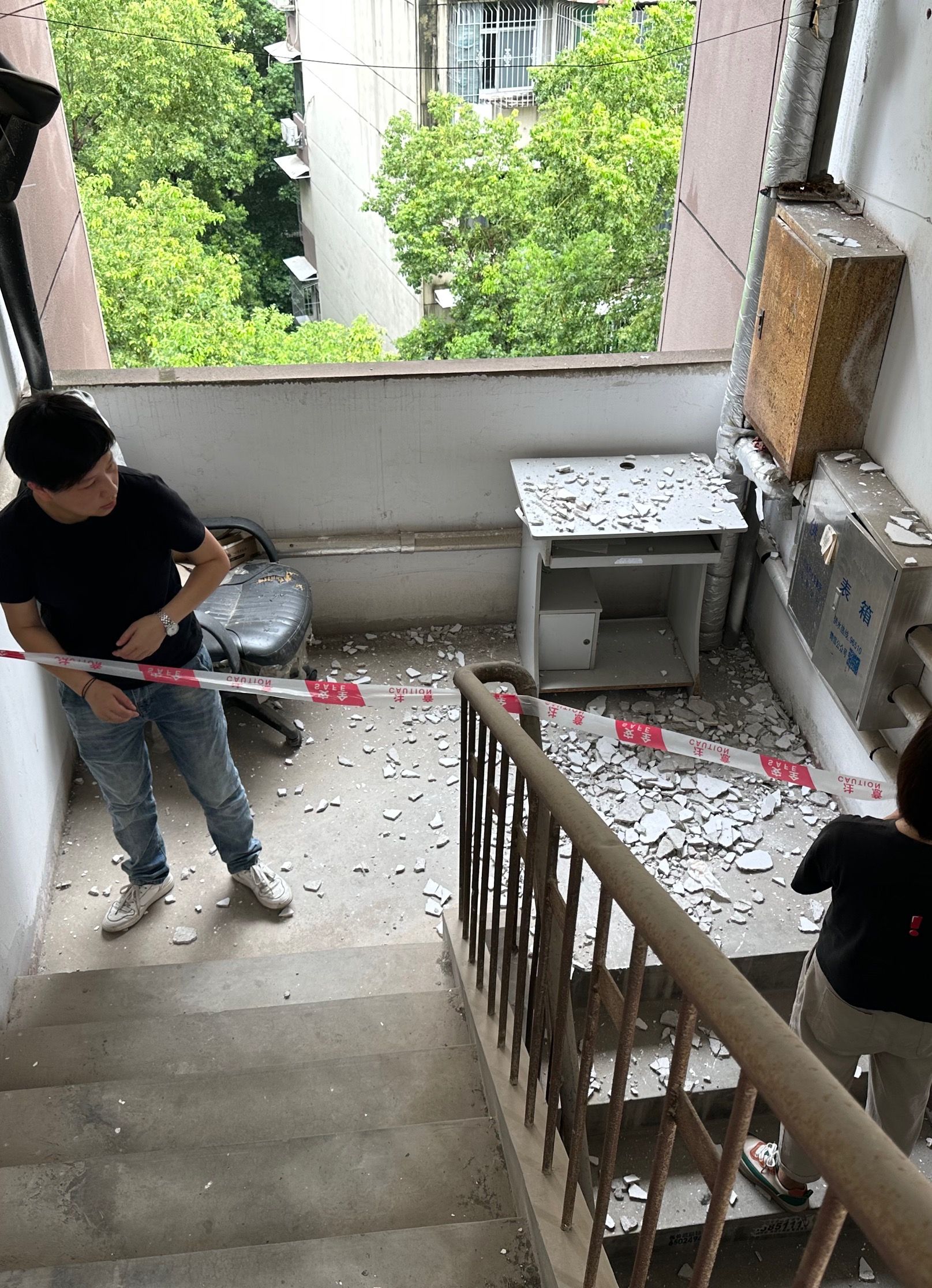 近日,武汉市江汉区汉兴街道新湾社区路长制工作人员在日常巡查时,有居民反应牛奶场宿舍2栋4单元楼顶的墙皮严重脱落,工作人员立即前往现场,经查看,该单元7层楼梯间天花板墙皮发生脱落,面积约2平米,事发时无人员经过,未造成人伤。现场天花板距离楼梯间地面约有4米多,脱落墙皮边缘仍有缝隙,存在再次大面积脱落的风险。社区第一时间安排人拉起警戒线并在网格群里宣传告诫居民请勿靠近。