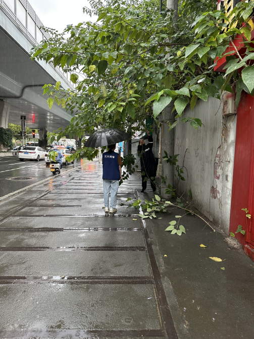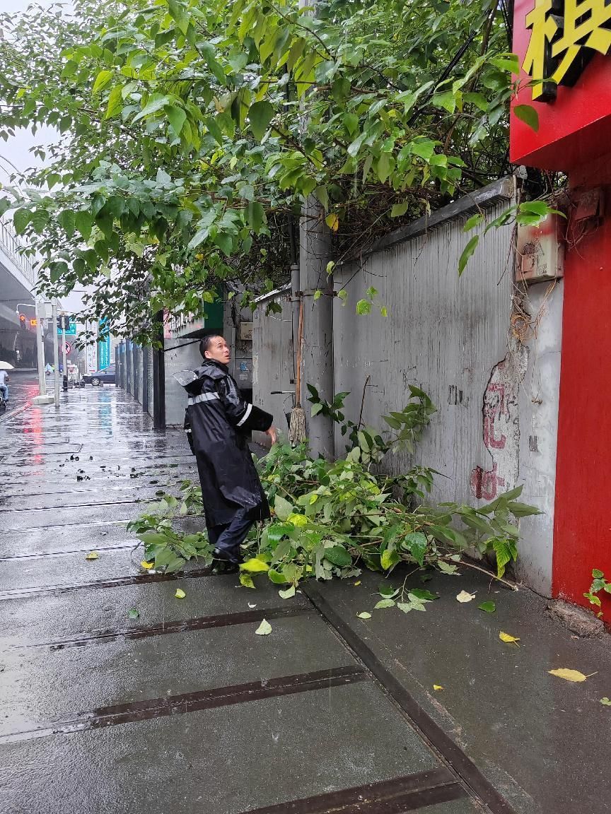 和祥里社区工作人员得知情况后,与相关物业方、园林局沟通修剪树枝,因程序繁琐冗长,为保障居民出行安全,社区迅速启动应急预案,工作人员冒雨对该路段的树枝进行处理,高效及时有效地排除了道路安全隐患,为保障居民平安畅通出行提供了有力保障。