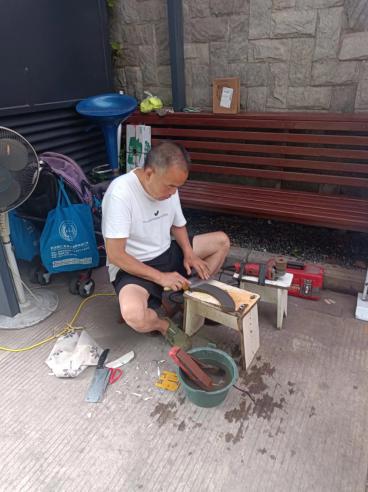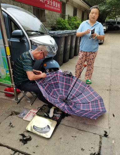 义诊活动同时,理发、磨刀、修伞的志愿者师傅们也支开工具设施,为居民进行便民服务:理发师傅娴熟的推剪技艺让老人们一个个容光焕发;磨刀师傅与时俱进用上了电动磨刀器,操作之间火花闪动,一把把用钝了的刀剪一会儿就变得蹭亮而锋利;居民们把舍不得扔掉的坏伞拿给修伞师傅,经过师傅巧手修缮伞一会儿就能撑收自如了,一把把撑开的伞就像绽放的花朵,仿佛在诉说共同缔造催开了美庐社区居民内心的幸福之花。