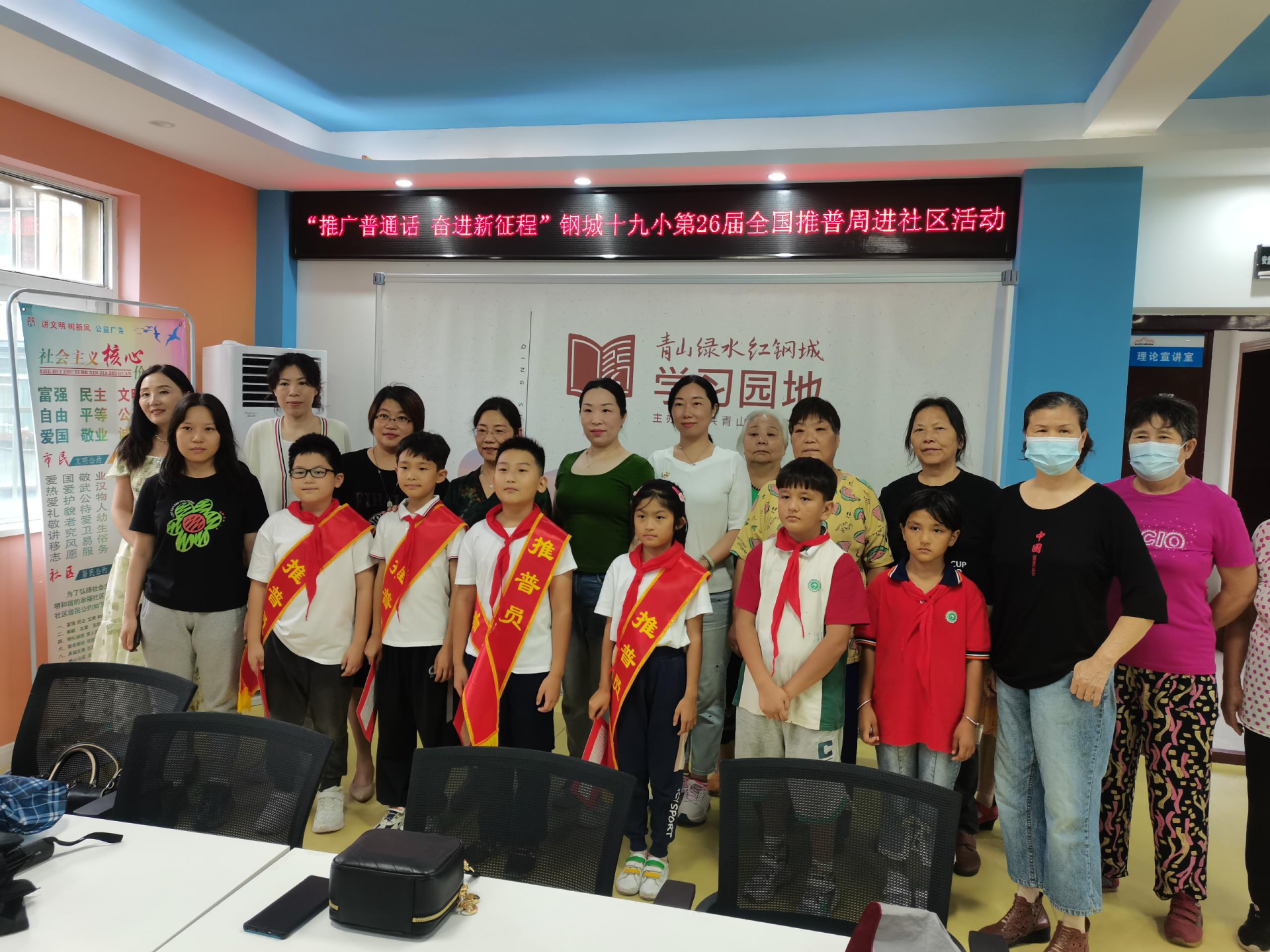 钢城第十九小学教师向辖区居民、未成年人讲述推广普通话的意义和讲好普通话的好处,介绍了普通话在服务铸牢中华民族共同体意识等方面的积极作用,带领新疆维吾尔族小学生学防电诈宣传语,教大家讲好普通话,带动整个家庭学起来、用起来,与父母共同体会说普通话、写规范字的意义,营造温馨和谐的家庭氛围。