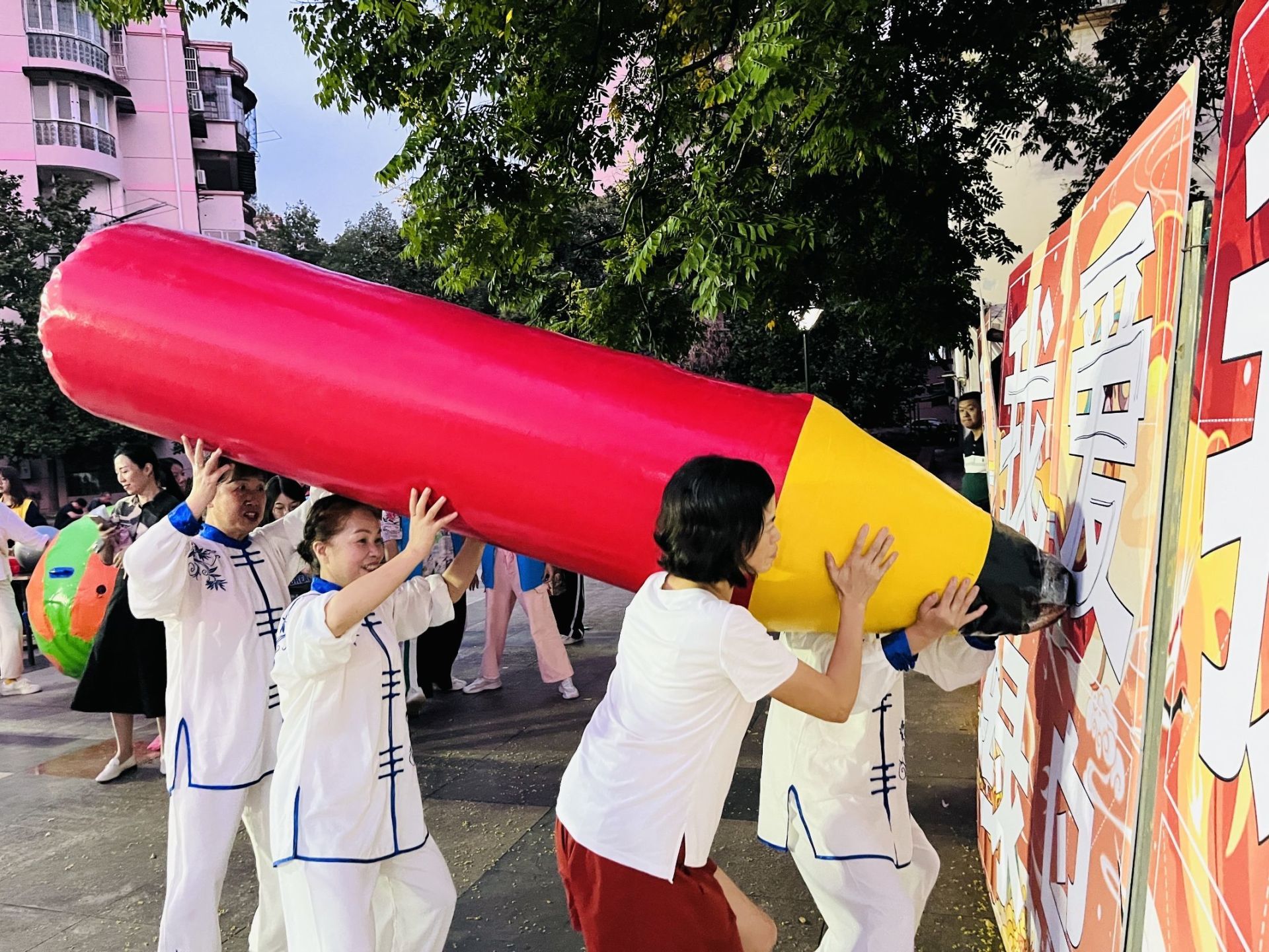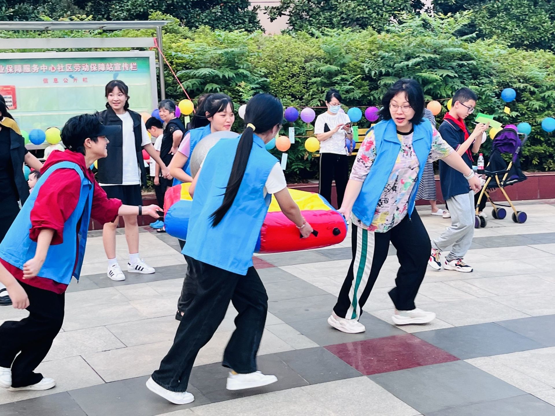 在“众星捧月”游戏中,志愿者号令一发,大家快速协作掂球前进,用时最短的队伍获得了胜利;在“明月当头”游戏中,参与的小朋友们斗志昂扬,将乾坤球高高举过头顶,团结协作,用最快的速度完成了往返跑;在“奋笔疾书”游戏中,队员努力控制大笔,在KT板上写下大大的“我爱绿岛”;在“袋鼠跳”游戏中,大人和小孩纷纷跳进布袋,合作将西瓜球运至终点,现场奇趣满满、欢笑不断。