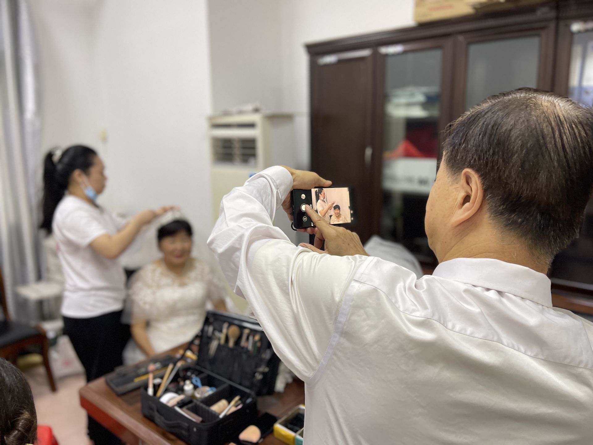 最好的亲情记录是一张全家福。当七十多岁的梅师傅第一次见到老伴穿上婚纱的样子,就激动地流下了眼泪:“一辈子都没有过这样的机会,我们都没有照过结婚照,真的是太感谢社区了”;林师傅带着父母、儿子、孙子拍摄四世同堂大合影,九十多岁的伉俪精神矍铄,情比金坚,双手紧紧地交握着;八十多岁的彭师傅一头银发,穿上了从未穿过的婚纱,脸上泛起了红晕,回想起了刚结婚的时候的羞涩。路过围观的居民们也被这样幸福温暖的氛围感染,一张张充满温暖和爱的全家福被定格,长辈们的互相扶持,父母间的其乐融融,孩童们的欢声笑语跃然于照片之上,定格着幸福、喜悦与美好。