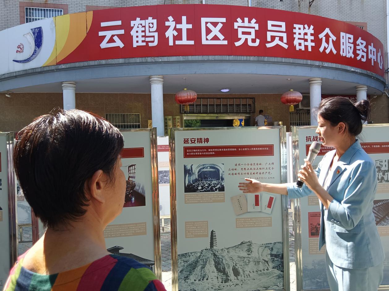 在第二批主题教育启动之际,为深入学习宣传贯彻党的二十大精神,引导广大党员干部群众深刻领悟中国共产党人精神谱系的丰富内涵和时代意义,更好地弘扬伟大建党精神,韩家墩街道云鹤社区联合中共一大纪念馆、武汉中共中央机关旧址纪念馆开展流动展览进社区活动。一大早,志愿者就将展板摆放好,展览以习近平总书记在庆祝中国共产党成立100周年大会上的重要讲话和党的十九届六中全会精神为指引,紧紧围绕主题,以图文并茂的方式集中讲述了伟大建党精神、井冈山精神、新时代北斗精神、丝路精神等,展示在伟大建党精神引领下党和人民的百年奋斗历程,让观众深切感受到伟大建党精神的力量。大家一边观看展览一边认真聆听讲解员的讲解,在场一位党员说道:“我们今天的美好生活是先辈们抛头颅、洒热血换来的,没有共产党就没有新中国。作为一名共产党员,我们要始终感党恩,听党话,跟党走,为祖国多做贡献。”