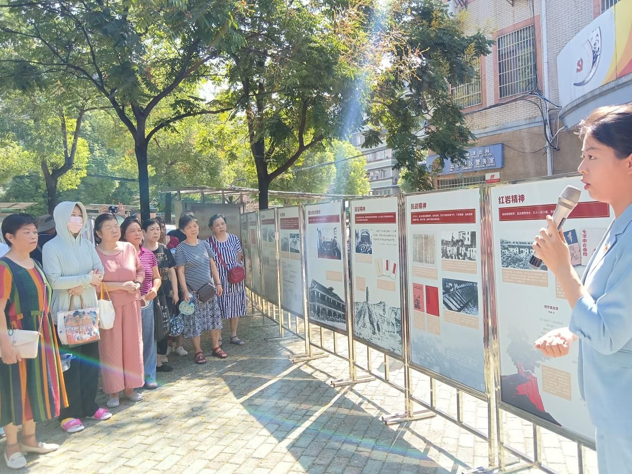 9月19日,在武汉市硚口区韩家墩街道云鹤社区广场上,一组图文并茂的“伟大精神铸就伟大时代”为主题的中国共产党伟大建党精神专题展吸引了不少党员和居民驻足观看。