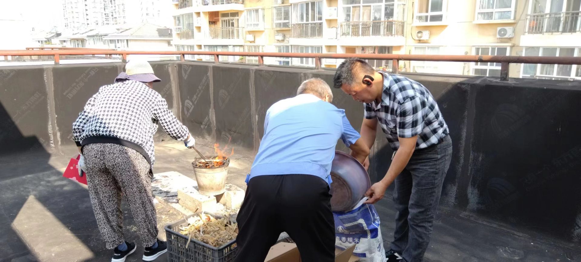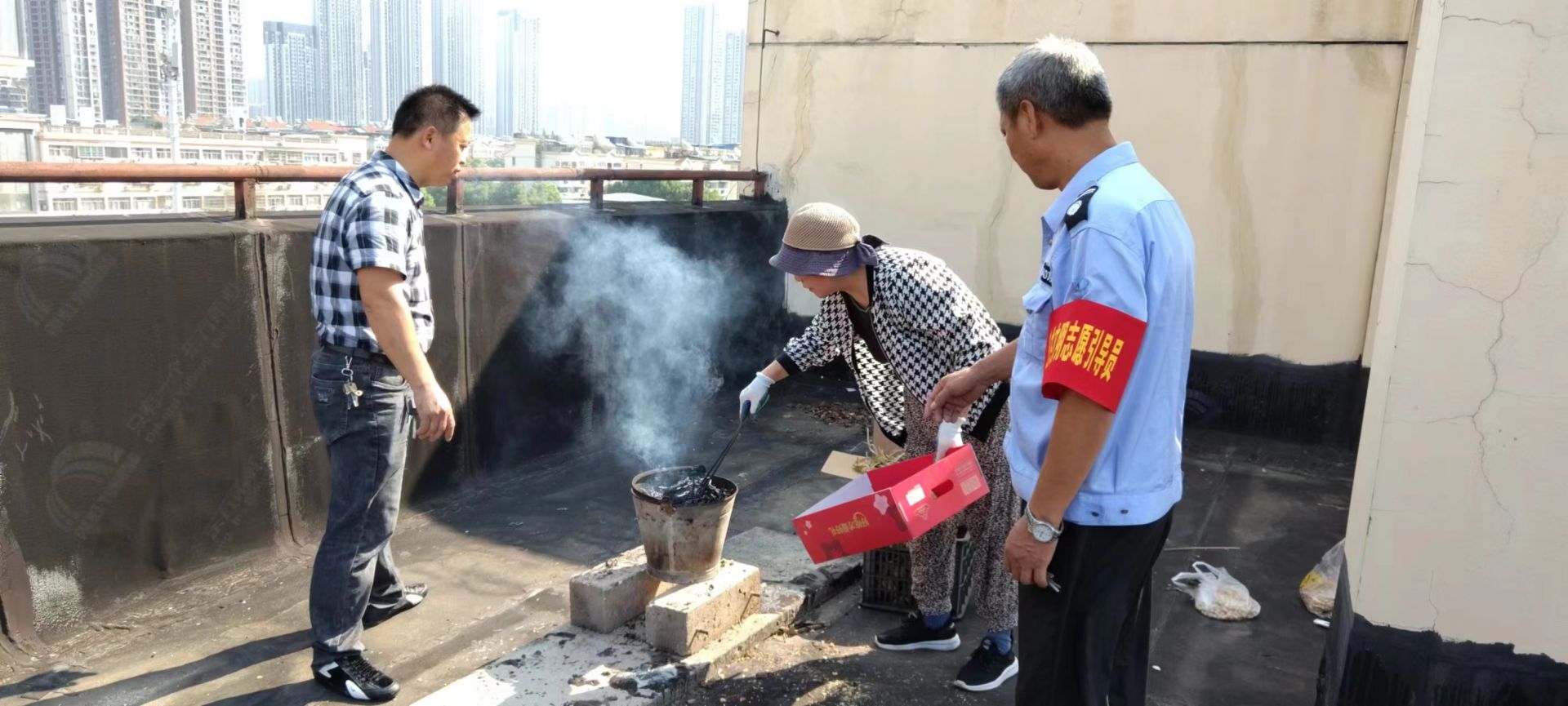 现场检查发现,楼顶的防水层已经出现了缝隙,加上居民在楼顶种菜,浇水时水通过缝隙流到居民家中,将墙壁渗湿。社区先从楼顶种菜开始协调,跟种菜居民讲了种菜要浇水,居民家中漏水的事情,做通了居民不种菜的工作,后协同物业对该楼顶防水层进行加固,同时安排物业在每次大雨过后前往楼顶清扫积水,居民家中渗水情况有了明显的改善。但因该楼体结构设置,楼顶存在积水点,积水时间一长就会渗入和破坏防水层,为彻底解决居民的烦心事,物业自掏腰包将积水处用水泥进行处理和找平,并重新铺设防水层铺设沥青。处理过程中,社区及时向居民同步维修动态,做好沟通解释工作。经过两天紧锣密鼓的施工,目前该楼顶防水维修已全部完工。