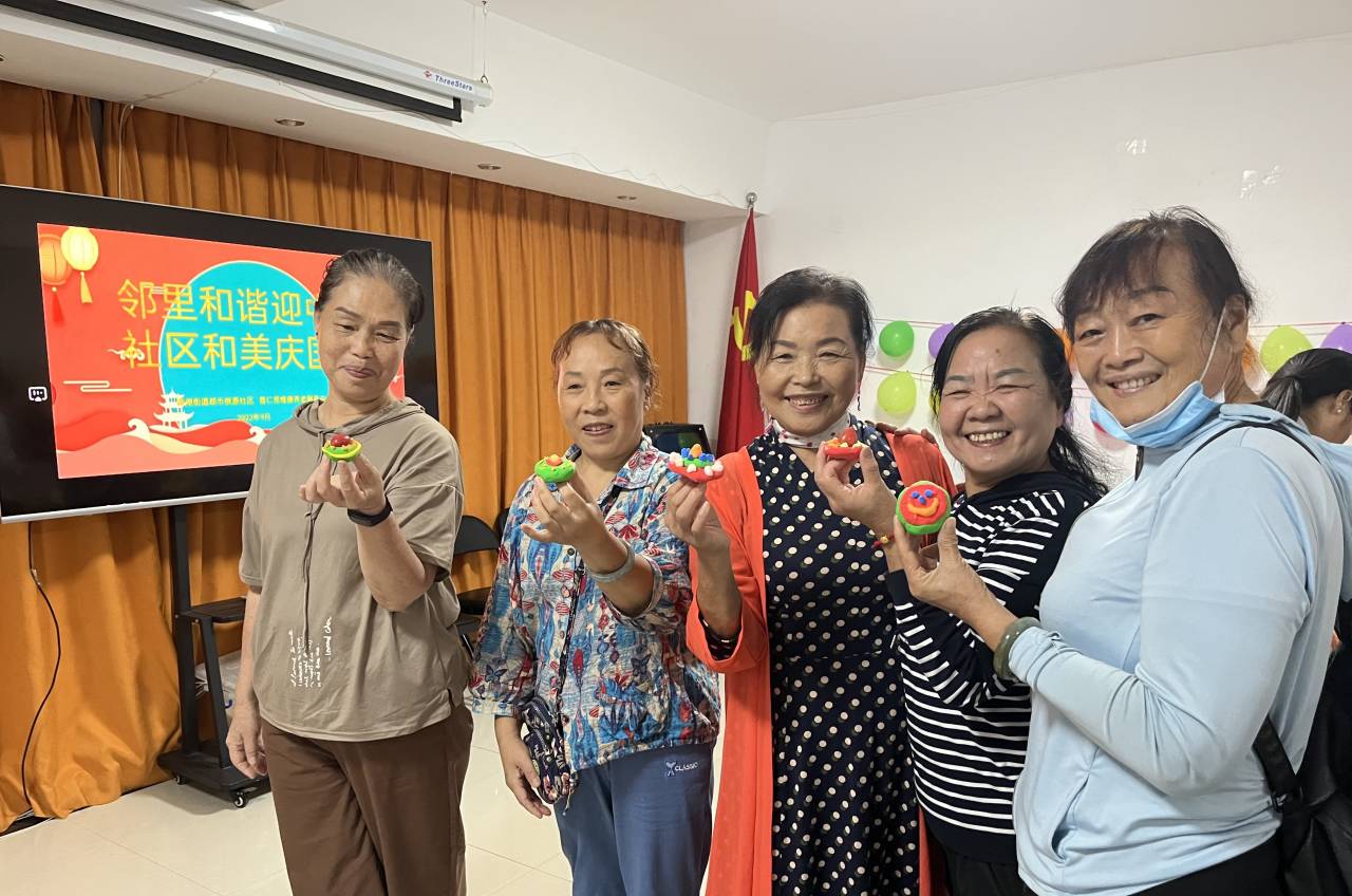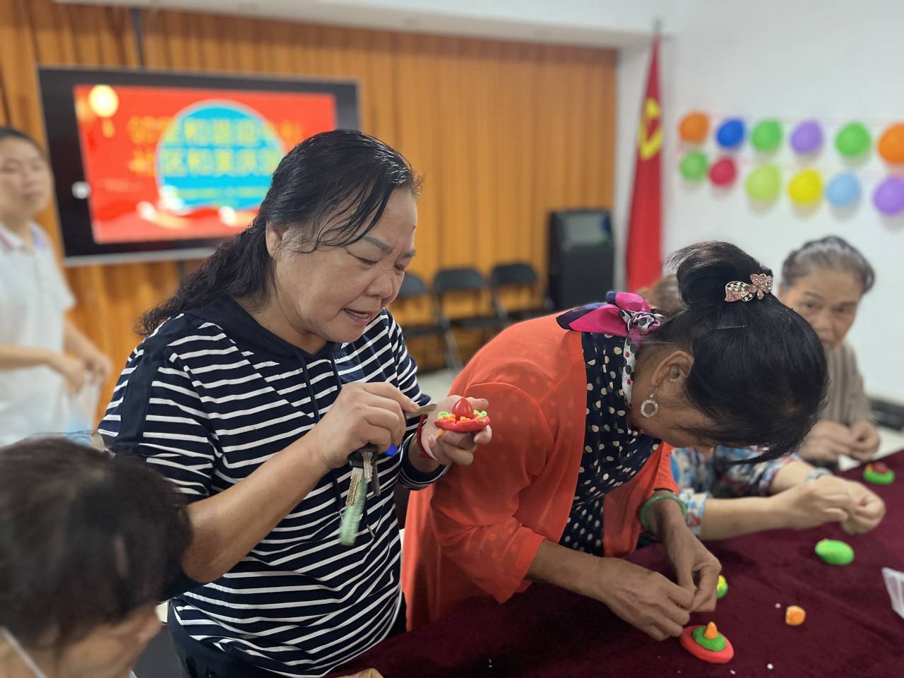 活动中,社区为居民们准备了月饼、水果等美食,还准备了空气黏土给大家制作月饼模型,大家一边设计自己的月饼造型,一边动手操作,其乐融融。同时还准备飞镖扎气球小游戏,把学习强国的提问放进气球中,扎破气球并答对的居民会获得小礼品,通过小游戏互动,增进了人们之间的感情,学习了强国知识,弘扬伟大的爱国主义精神,让爱国主义扎根基层,深入人心。社区工作者与居民边品尝美食边聊家常,了解各位居民的家庭生活和身体状况,倾听对社区、养老服务中心工作、建设的意见和建议。