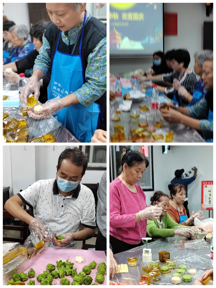 月饼制作区也是笑声不断,大家有条不紊的分工合作,有的搓馅、有的压膜,有的装盒,在一片欢声笑语中,一个个精致的冰皮月饼逐渐成型,大家纷纷将做好的月饼放进精美的包装盒中。制作完成后,大家围坐在一起,共享美味,共话家常。香甜的味道萦绕在大家的鼻尖,现场其乐融融,弥漫着一派欢乐祥和的景象。李奶奶说道:“好久没有感受到这麽热闹的气氛了,今天的活动玩得很开心,我要把自己亲手做的月饼带回去跟家人分享。”