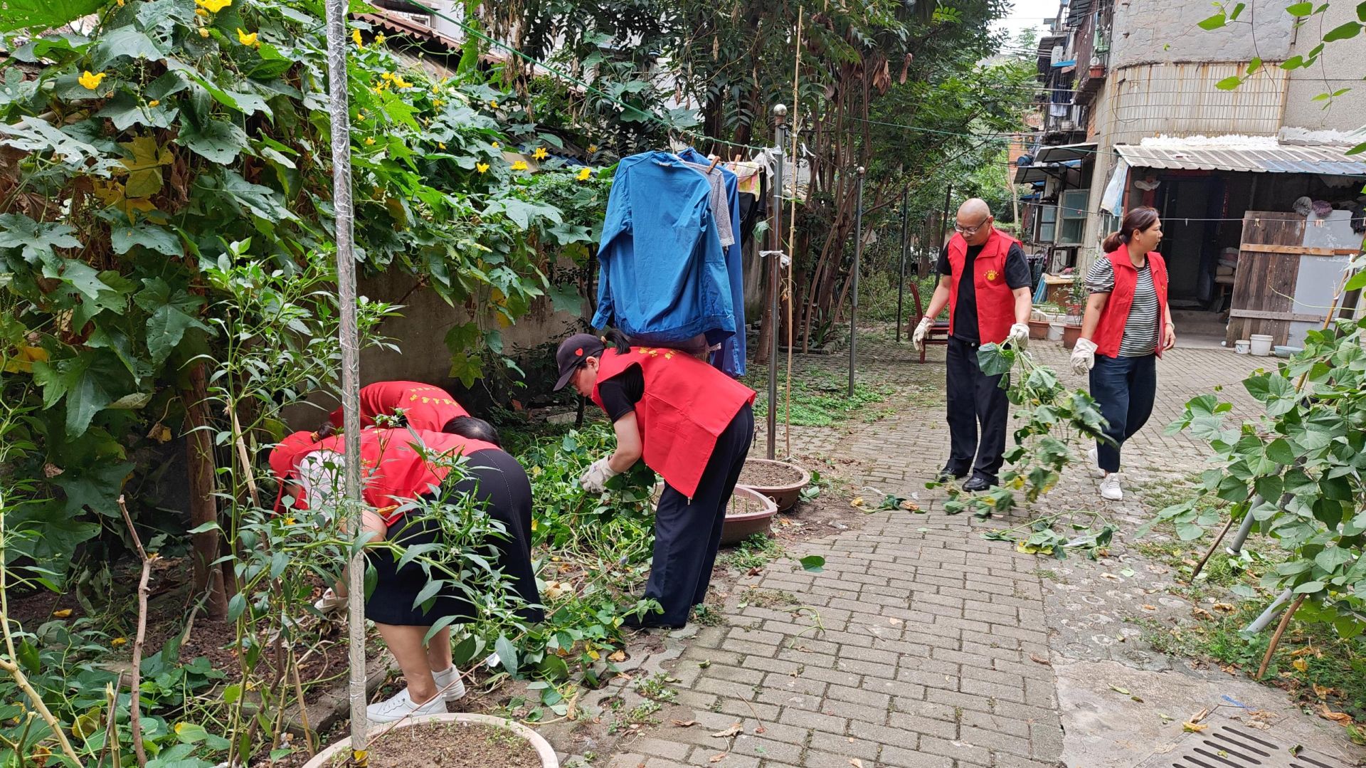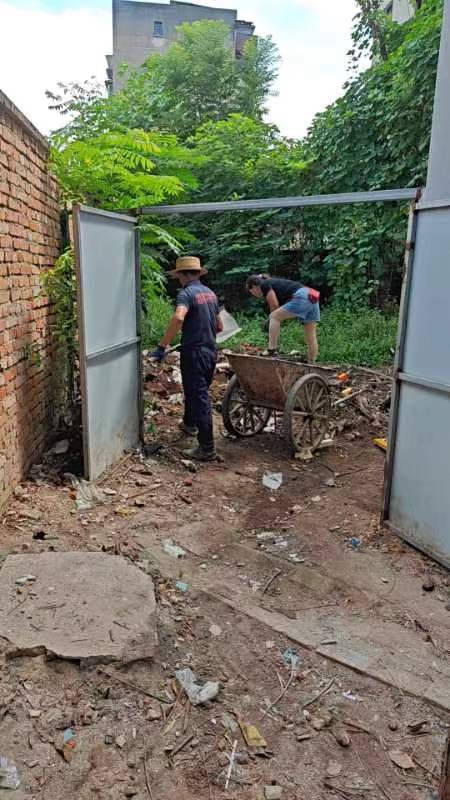 小区绿化带被擅自改成私家菜园,路长组织清理时发现院墙外还藏有大量建筑垃圾,经多方调查,最终确定归属单位,责令清理。