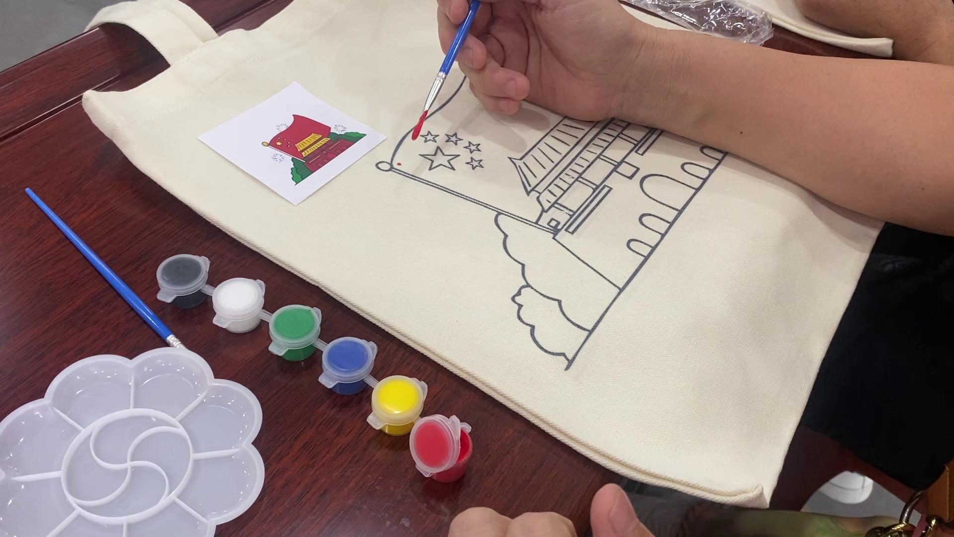 活动中,志愿者准备环保袋、画笔等制作材料,大家发挥创意,调配颜料,为空白的环保袋增添色彩。