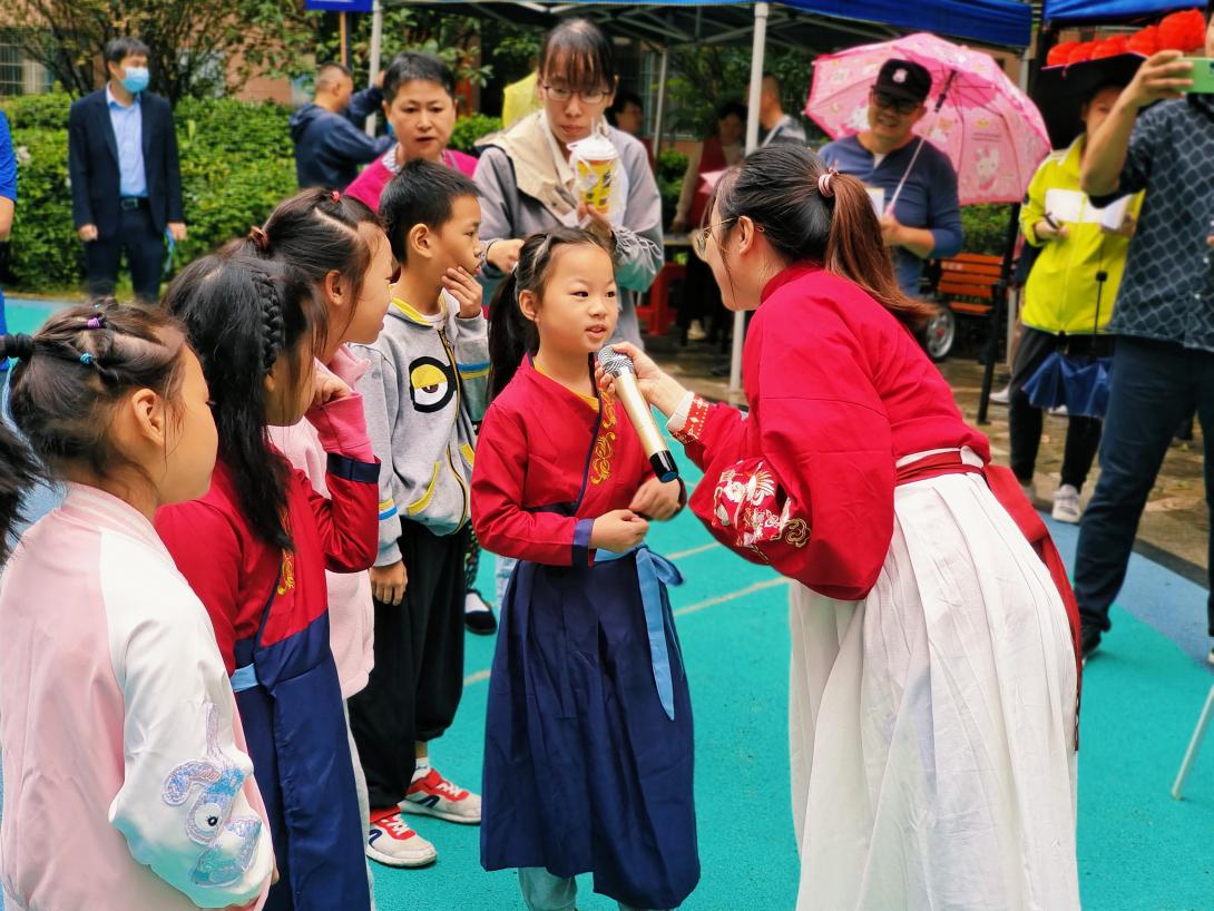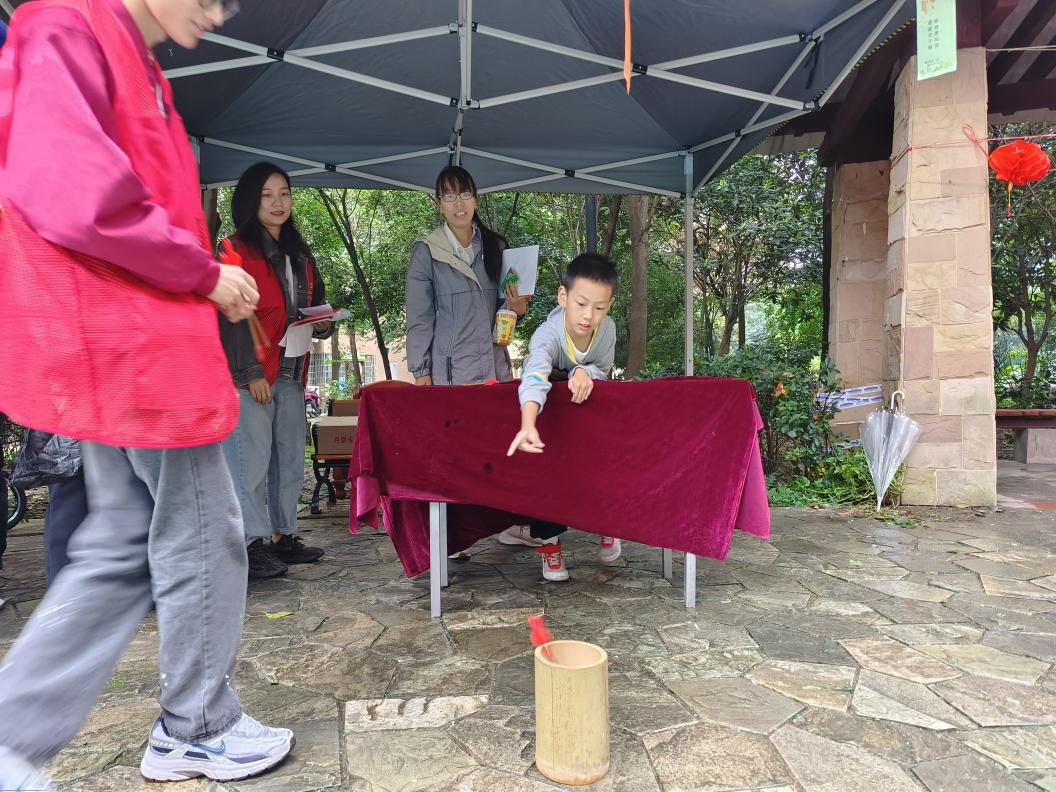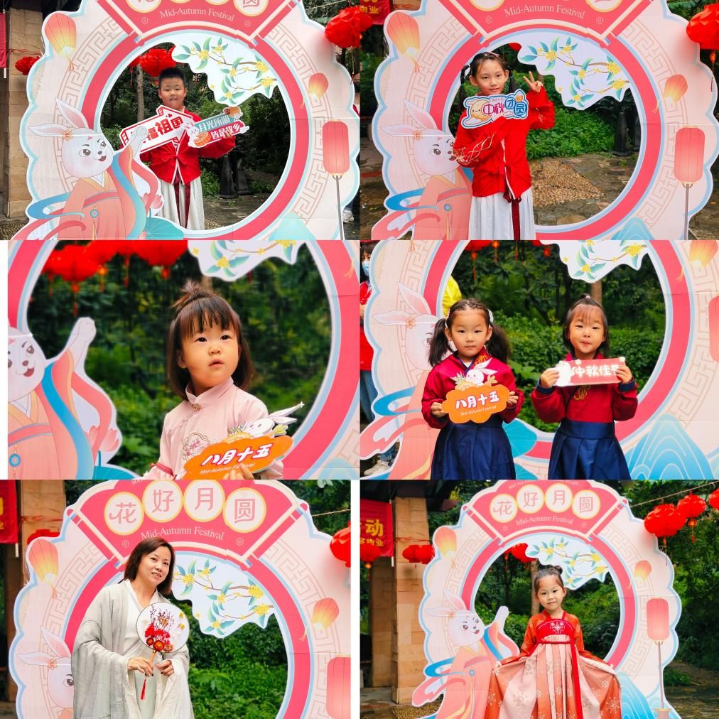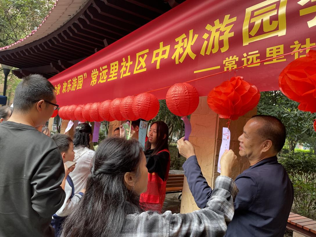 在民俗体验区,五彩缤纷的花灯高高挂起,一条条灯谜写在一盏盏精心制作的纸灯笼上面。居民们纷纷踊跃参与,或独自思考,或相互讨论,寻找答案的乐趣与节日的氛围相得益彰,居民们通过游戏集赞还都能领取到一份中秋礼物。在汉服拍照打卡体验环节,现场提供了一系列精美的汉服供居民们穿着拍照,居民们纷纷换上汉服,手持祝福牌,或独立、或合影,留下美好温馨的瞬间。