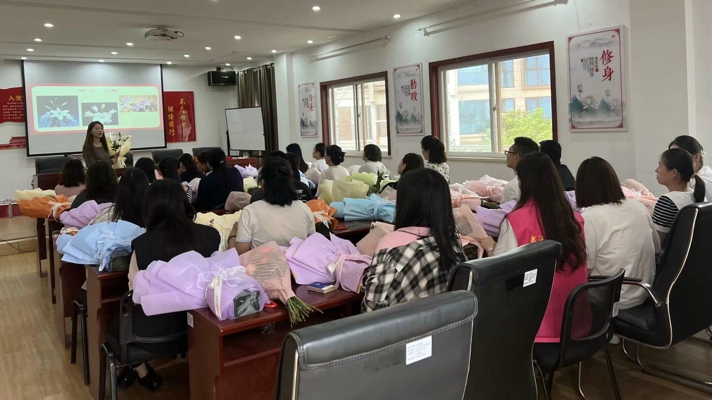 四溢的花香让二楼会议室充满了温馨浪漫的气氛。社区妇联精心准备好康乃馨、玫瑰、百合、雏菊等鲜花,并邀请资深花艺老师授课,内容包括插花艺术的基础知识、工具使用、插花造型和色彩搭配等,居民们热情澎湃,边学边问边尝试,仿佛插上了想象的翅膀,在芳香中享受着插花创作的愉悦,感受着生活的甜美。“老师老师,你看这完全符合我的风格,混搭风,也不错。”一位居民兴奋地描述着自己的作品。老师或鼓励或指导,让大家将缤纷的花卉按照自己的喜好和设想进行搭配、修剪、调整,创造出独一无二的艺术作品。